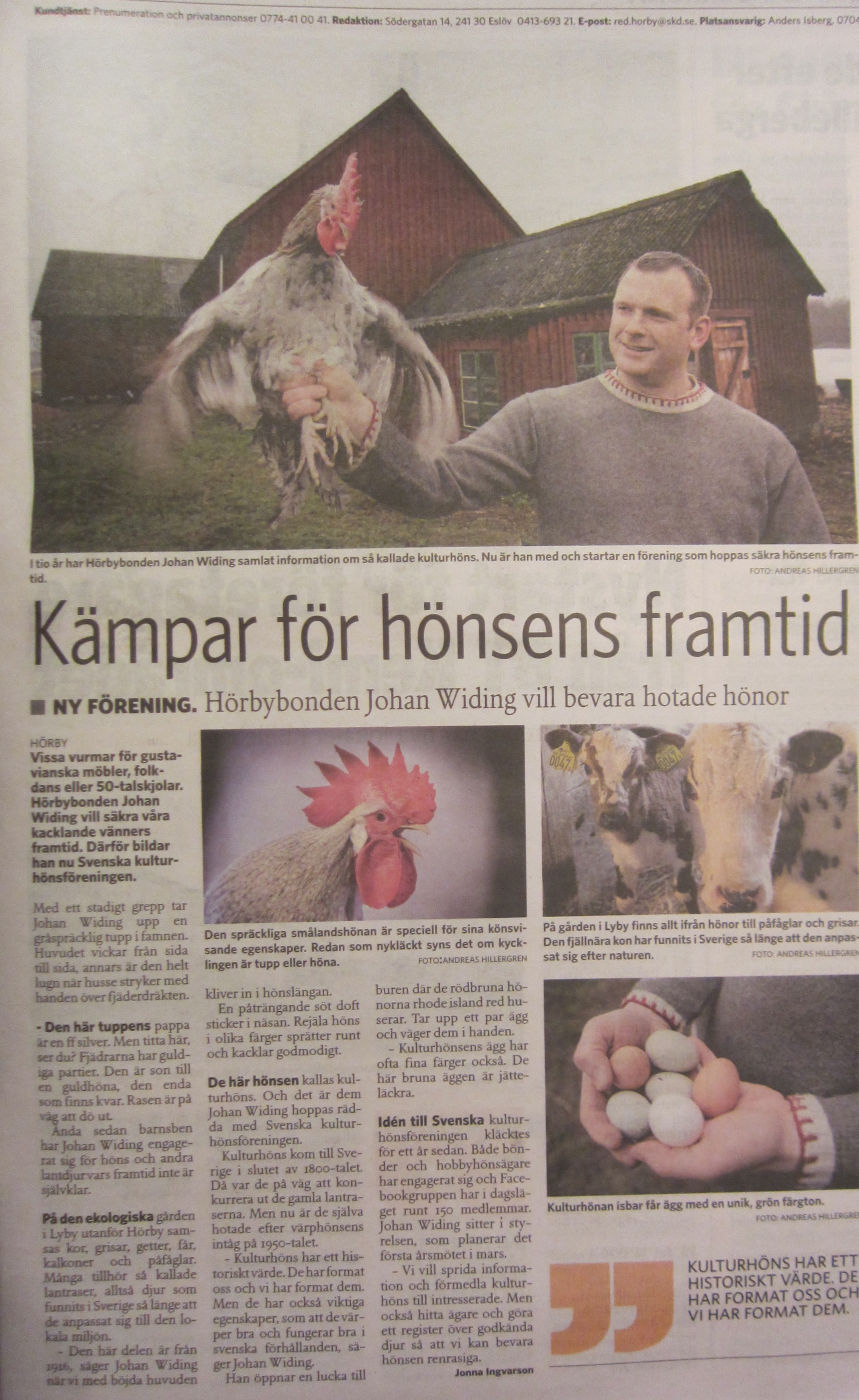 En glad överraskning i dagens Skånskan, nya Kulturhönsföreningen får lite mera reklam för sin verksamhet, i dagsläget finns det en interimsstyrelse men under våren kommer det att kallas till ett första årsmöte där föreningens stadgar och syfta kan antas. Mera information om föreningens arbeta hittar du på http://www.facebook.com/groups/356334151043263/ och dom olika raserna på http://www.bokeslundsgarden.com/about/9-hons