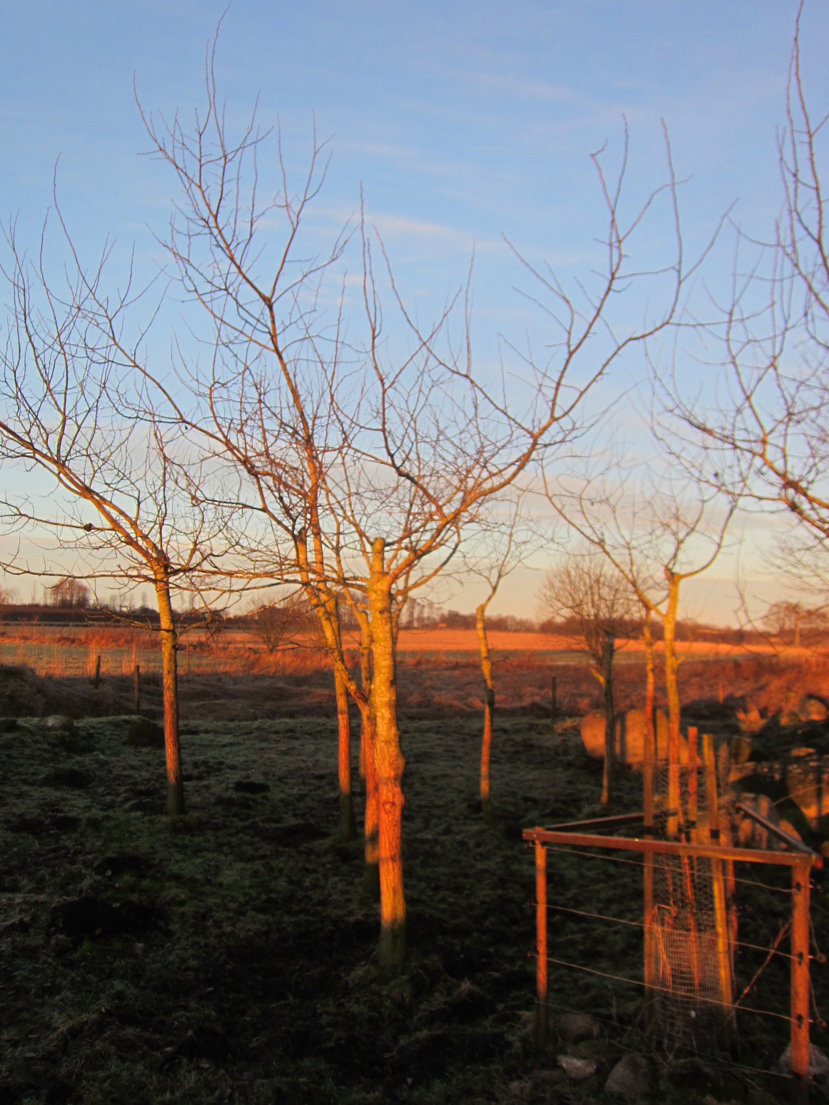 Vi har även planterat in cideräppelträd på de torrare delarna, dessa skal blir stora friväxande träd som ger mycket med frukt på hösten, massor av blommor på våren som bina kan pollinera och en skön skugga till djuren under sommaren. Dessa äppelträd måste dock skyddas i början så inte harar och rådjur skadar grenar och bark detta görs enkelt med lite vanligt hönsnät. Eftersom de växer i en hage där vi har kor och getter måste de även skyddas mot dessa och då är eltråden det enklaste alternativet för unga träd.