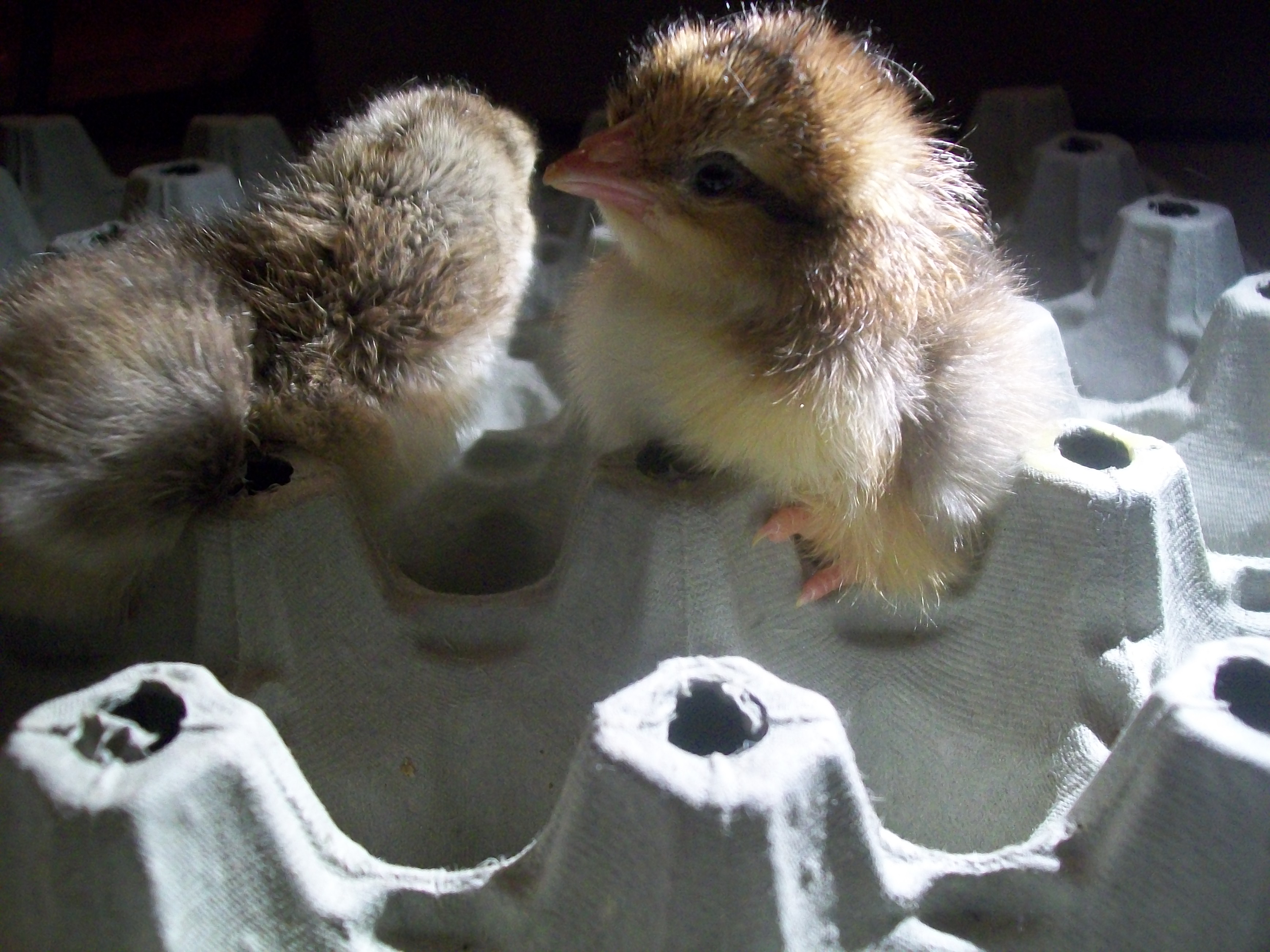 De två dunbollarna här ovan är bägge hönor av rasen Fifty five flowery FFF den kommer i två varianter guld och silver och dessa är en av varje. Rasen skapades 1955 av pastorn Martin Silverudd och var framtagen som en höna för den småskalige äggproducenten namnet är en kombination av året som den skapades och flowery (blommor) som är namnet på det vita fläckar som de vuxna djuren har. Den andra Könsvisande rasen som vi har är Smålandshönan den är skapad av samma man och lägger bruna ägg där FF lägger vita.
