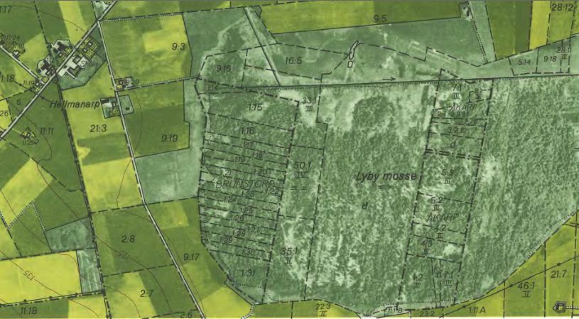 Man skapade många små mosslotter som ofta låg i anslutning till kanten så att man kunde ta sig dit med nån typ av fordon vanligen häst och vagn. Hur man använde sin mosslott skiljde sig mycket, vissa hade det som torvtäckt under lång tid och dessa områden är i dag värdefylla viltvatten där fåglar och amfibier trivs. Dom områdena som är gulmarkerade visar att det var odlad mark medan det som är streckat användes som torvtäckt och möjligen bete.