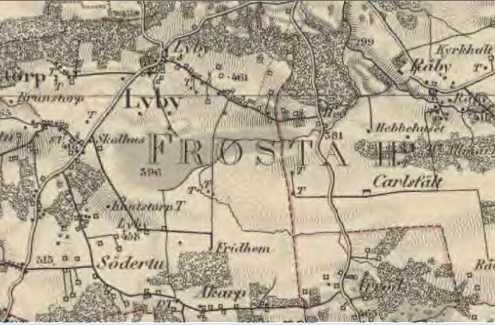 Det här med gamla kartor och fotografier har alltid fascinerat, det är väldigt lätt att tro att landskapet alltid har sett likadant ut men med hjälp av äldre materiel kan man få en mer korrekt bild av hur det har förändrats. 1865 såg gård ut såhär egentligen så finns inte ens vår gård då den bildades först 1917. Området till vänster om F i Frosta var det som senare skulle bli Bokeslundsgården, som man kan se var det öppen mark, som användes till bete eller odling.