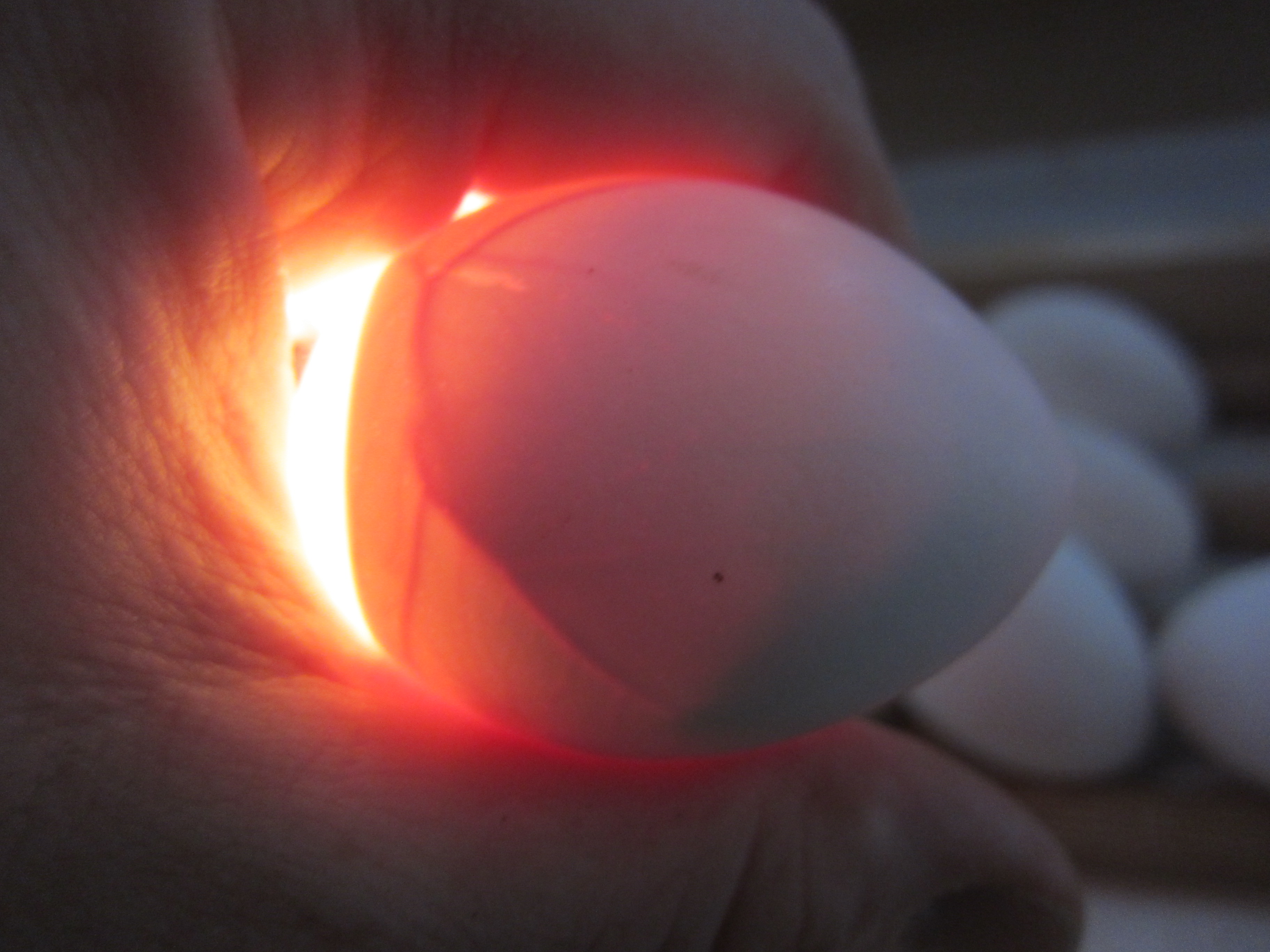Men det är inte alltid det går som planerat, något saknas eller blir fel och fostret dör. Istället för fina blodkärl är allt som återstår bara en mörk missfärgning och runt det hela en rödfärgad gloria. Inget annat att göra än att lägga dom i komposten och hoppas på att dom andra skall förvandlas till kycklingar på mindre än den veckan som återstår.