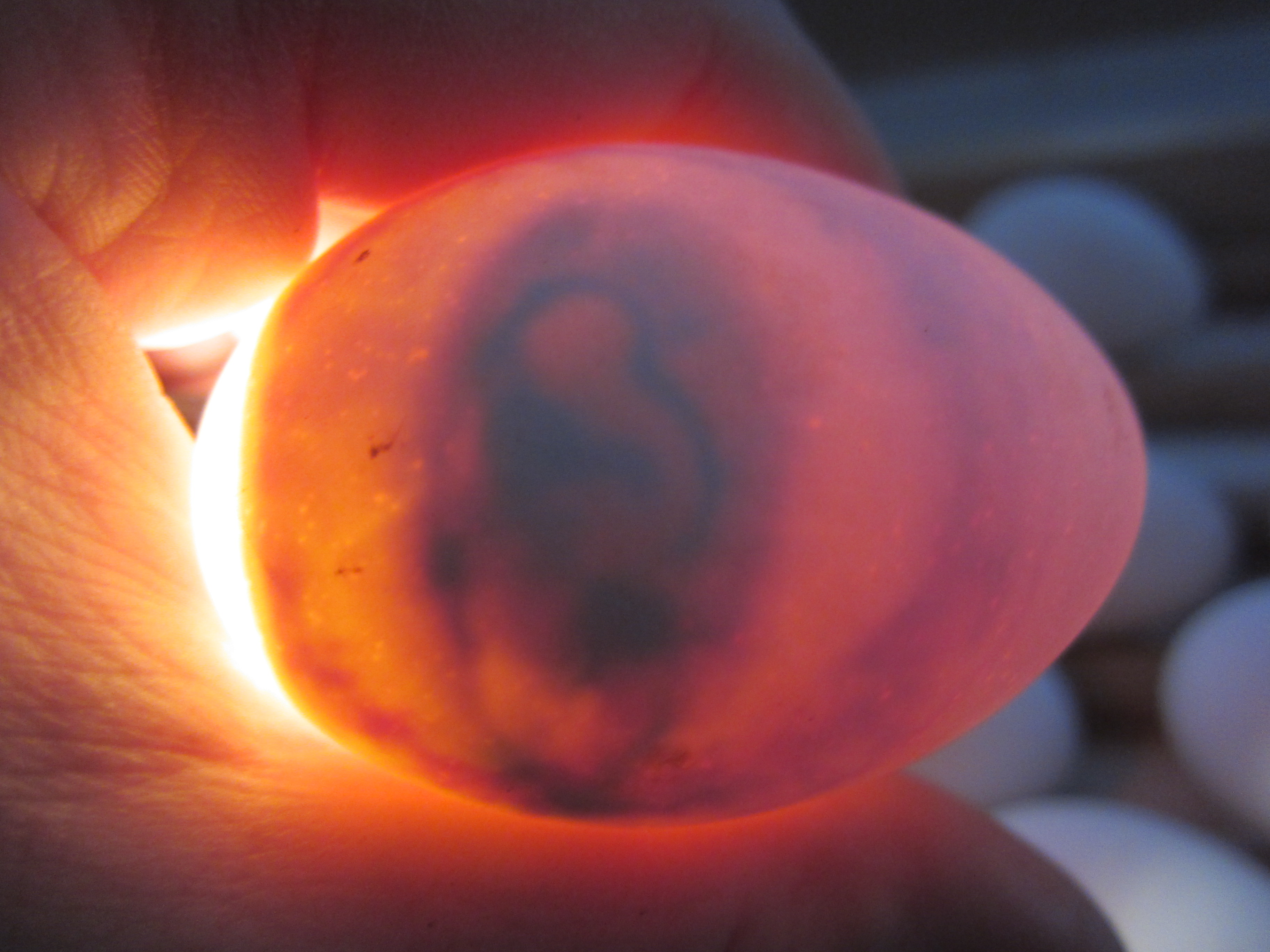 Det som för två veckor sedan var ett vanlig ägg har nu i den 37-gradiga kläckaren bara en vecka kvar på sin utveckling till en kyckling. Man kan se en mörkare skugga som är själva kycklingen och runt omkring i ägget finns blodkärlen som förser den med näring. Den har allt den behöver i form av vätska och näring och det enda den behöver är värme.