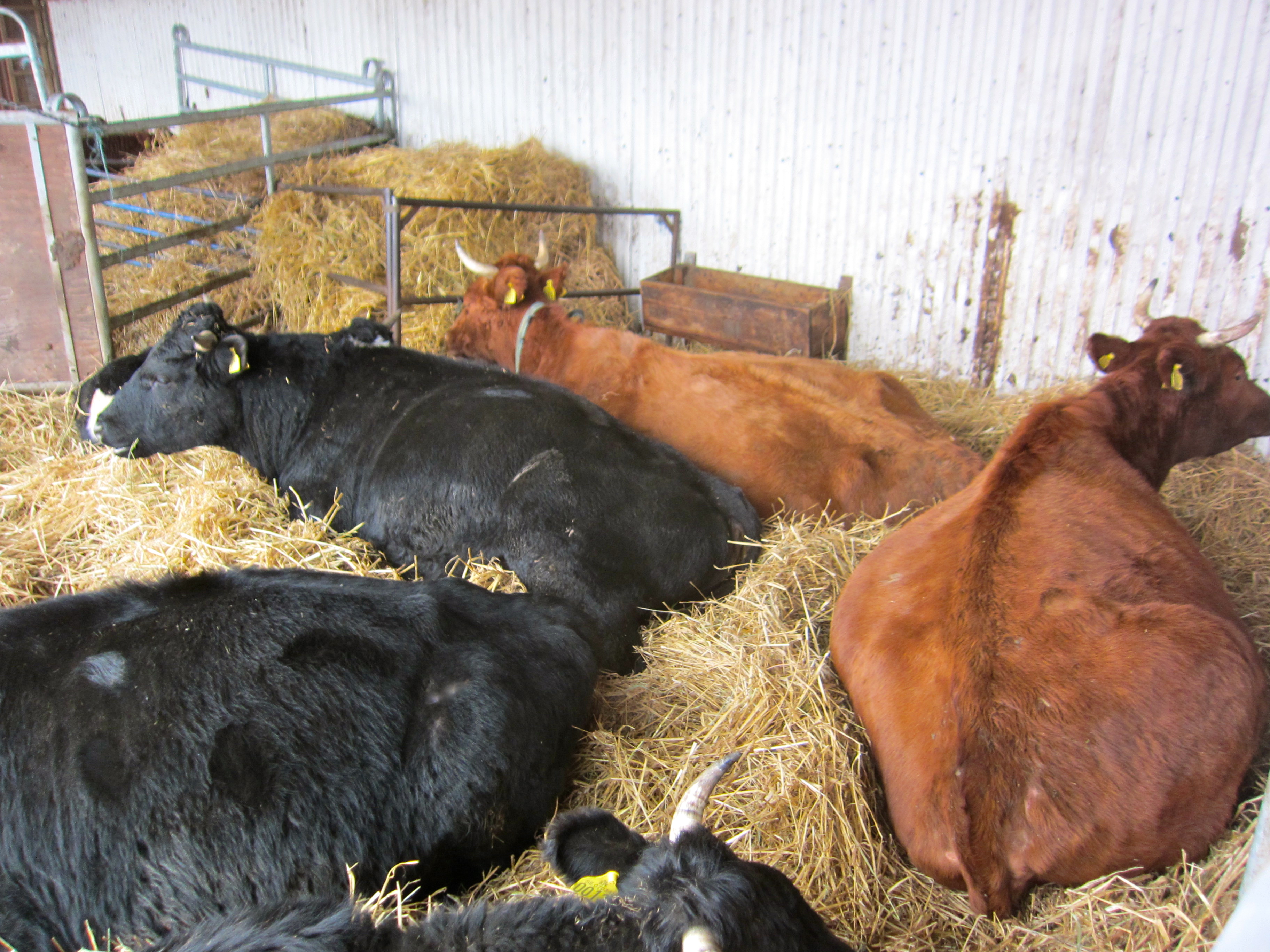 I vindskyddet har korna packat in sig som sälar på en klippa, den bruna damen i mitten är Gabriella är en av dom som står näst på tur att kalva och eftersom hon är näst högst i rang får hon den bästa platsen. Hennes storasyster Finally har redan fått flytta in i kalvninsboxen men som det ser ut nu kanske vi får byta plats på dom.