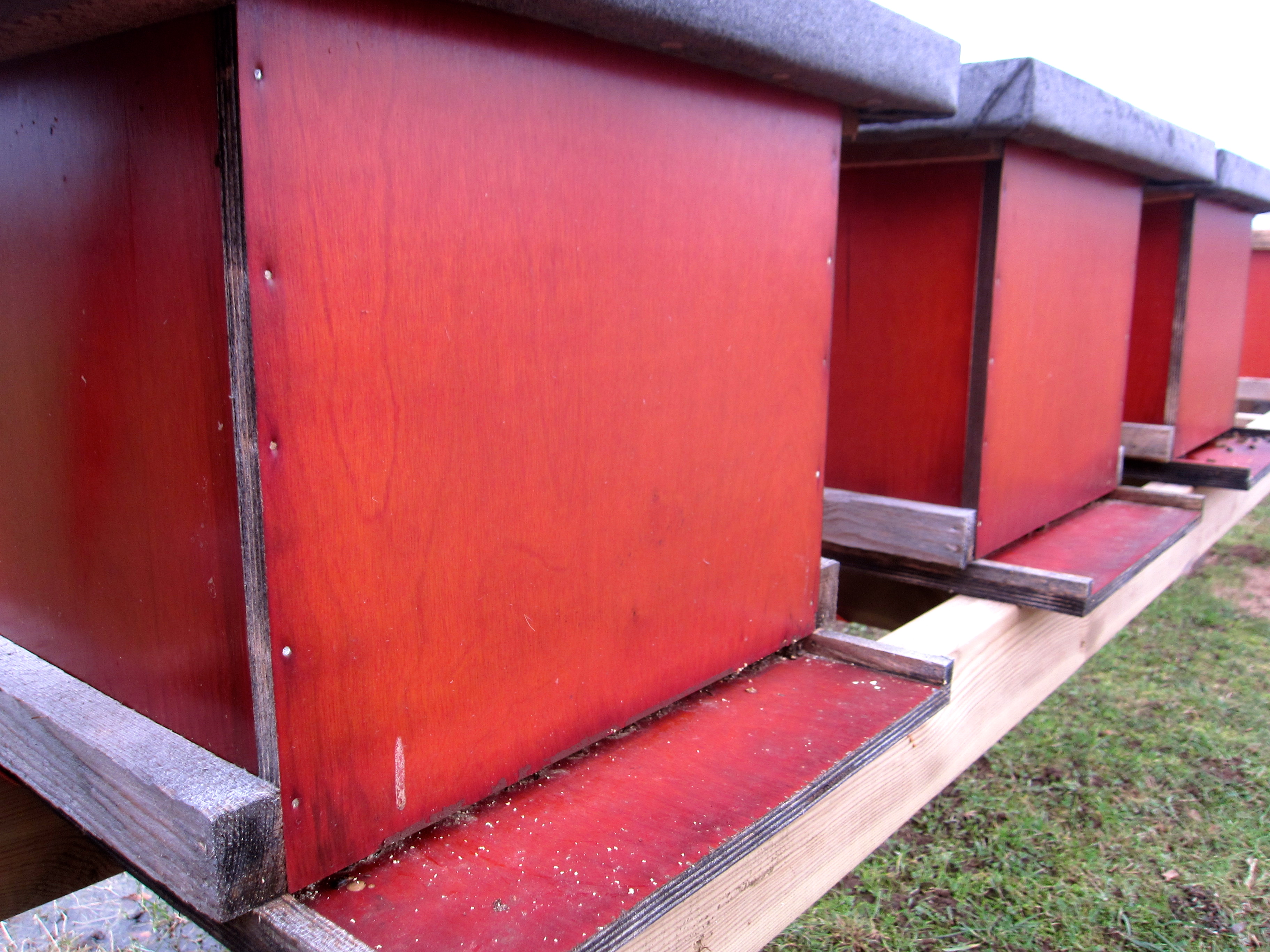 Våra egendesignade och hemma snickrade kupor fungerar utmärkt av fyra möjliga så verkar alla leva och ha hälsan om bara några veckor kommer dom att dra i gång med sitt vårarbete när drottningen börjar lägga ägg så att det finns tillräckligt med bin när Vide och Persika blommar till våren.