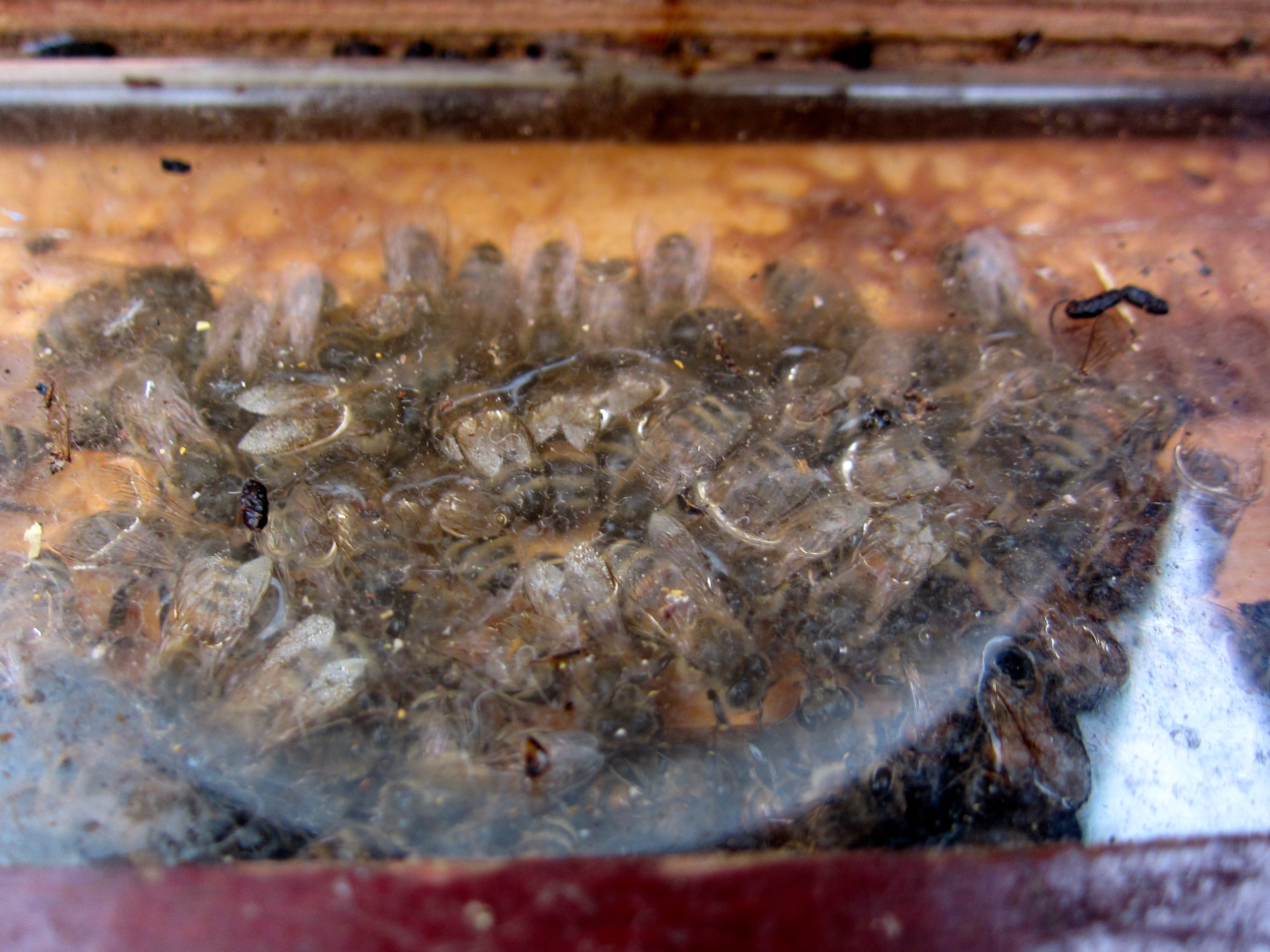 För att stilla vår nyfikenhet utan att störa bina har vi i några av kuporna installerat täckbrädor i glas i stället för trä för att kunna se binas aktivitet. Känns skönt att veta att alla samhällen har klarat sig så här långt.