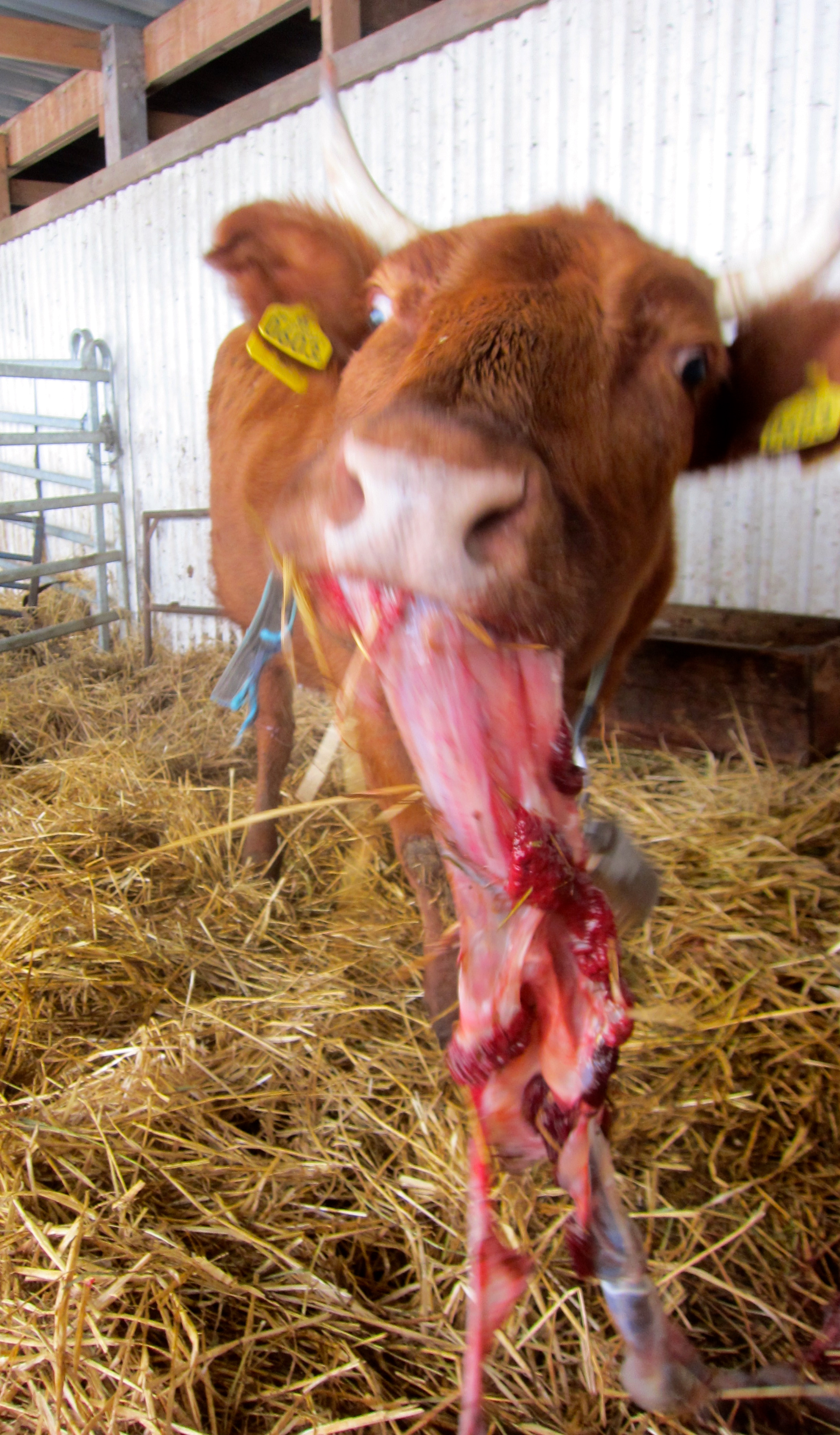 Gabriella som var den första som kalvade fick göra det i vindskyddet medan storasyster Finally fick kalvningsboxen inne i stallet eftersom det såg ut att det var horn som skulle kalva först. Gabriellas kalv blev lite nedkyld och hade svårt att hitta rätt så vi fick hjälpa till så han fick i sig den livsviktiga råmjölken som är fullmatad med energi och antikroppar som kalven behöver få i sig så fort som möjligt efter födseln. För att snabbt på i gång kalven mjölkar vi ut så mycket som möjligt ur kon, sen ger man kalven råmjölken via en son som man stoppar ner i magen via munnen, då får kalven snabbt i sig all mat och man vet att det inte rinner fel och hamnar i lungorna vilket kan leda till i bland dödliga lunginflammationer.