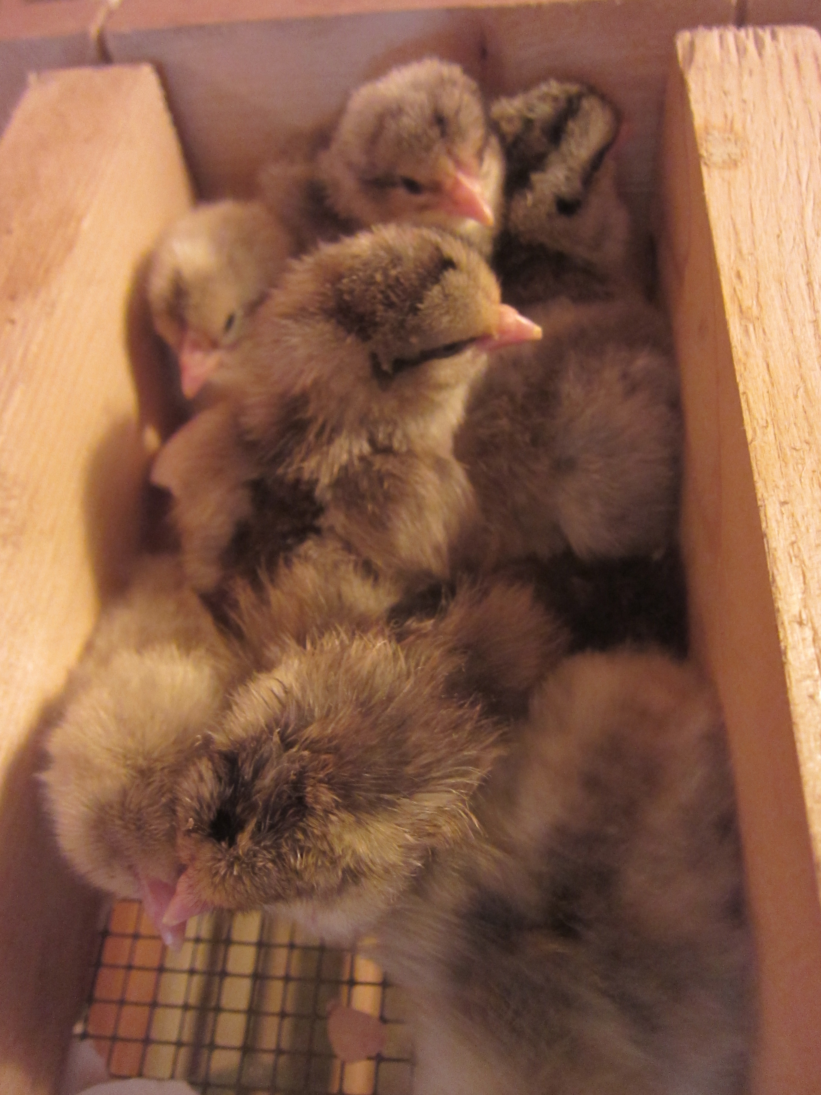 Det är inte bara killingarna som vill utforska sin miljö, en ny kulle med Smålandshöns såg dagens ljus i veckan. De kycklingarna som har mörka tecken vid ögat och på ryggen är hönor och dom som är mer ljusgrå är tuppar. Tittar man noga på deras näbbar kan man se den lilla äggtanden som dom använder för att göra hål på ägget så dom kommer ut.