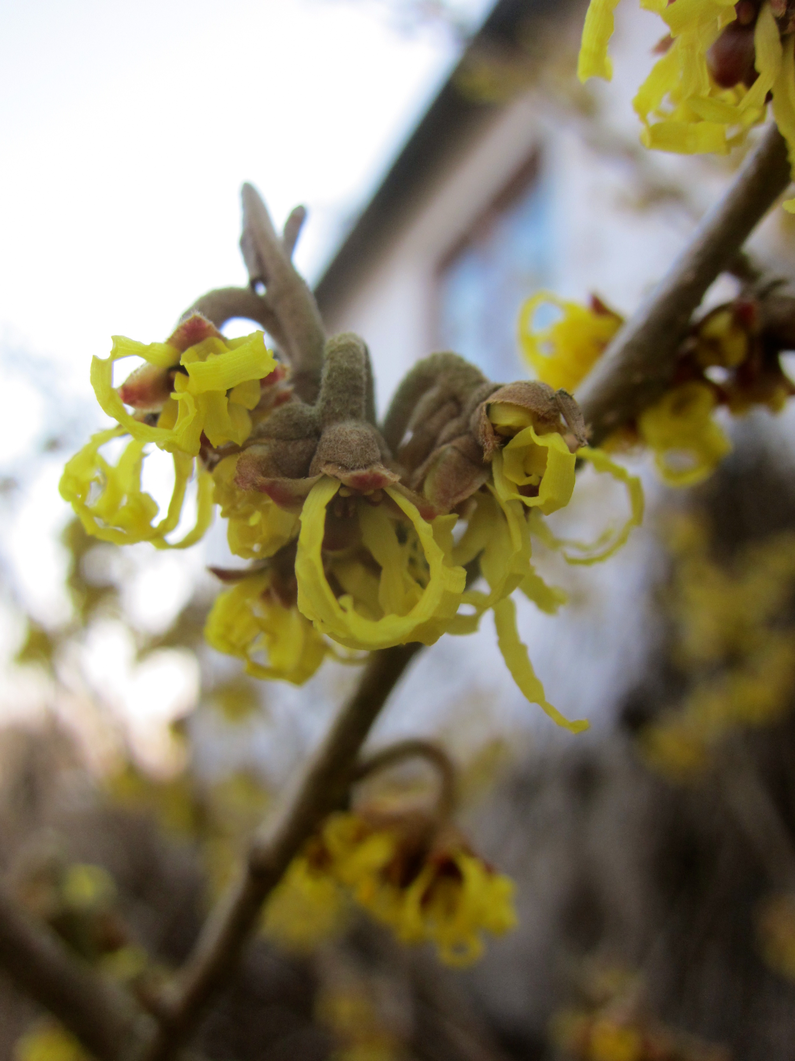 Här hemma möts man av vårens tidigast blommande buskar Hybridtrollhassel som fyller sina kala grena med vackert gula blommor