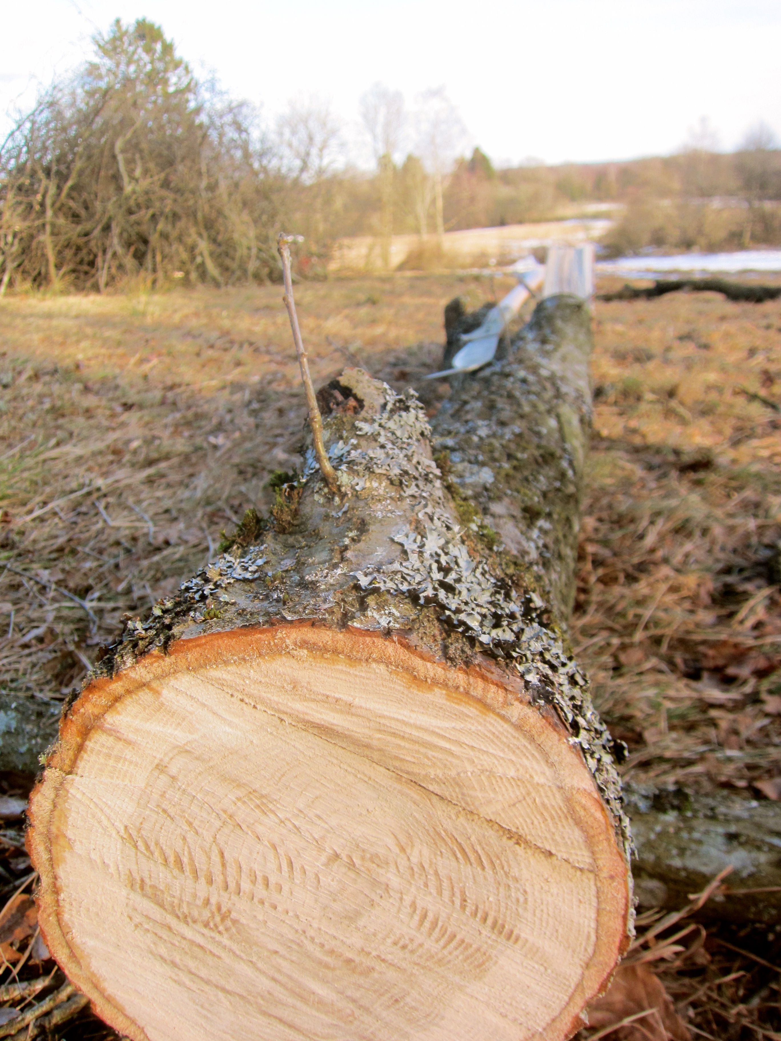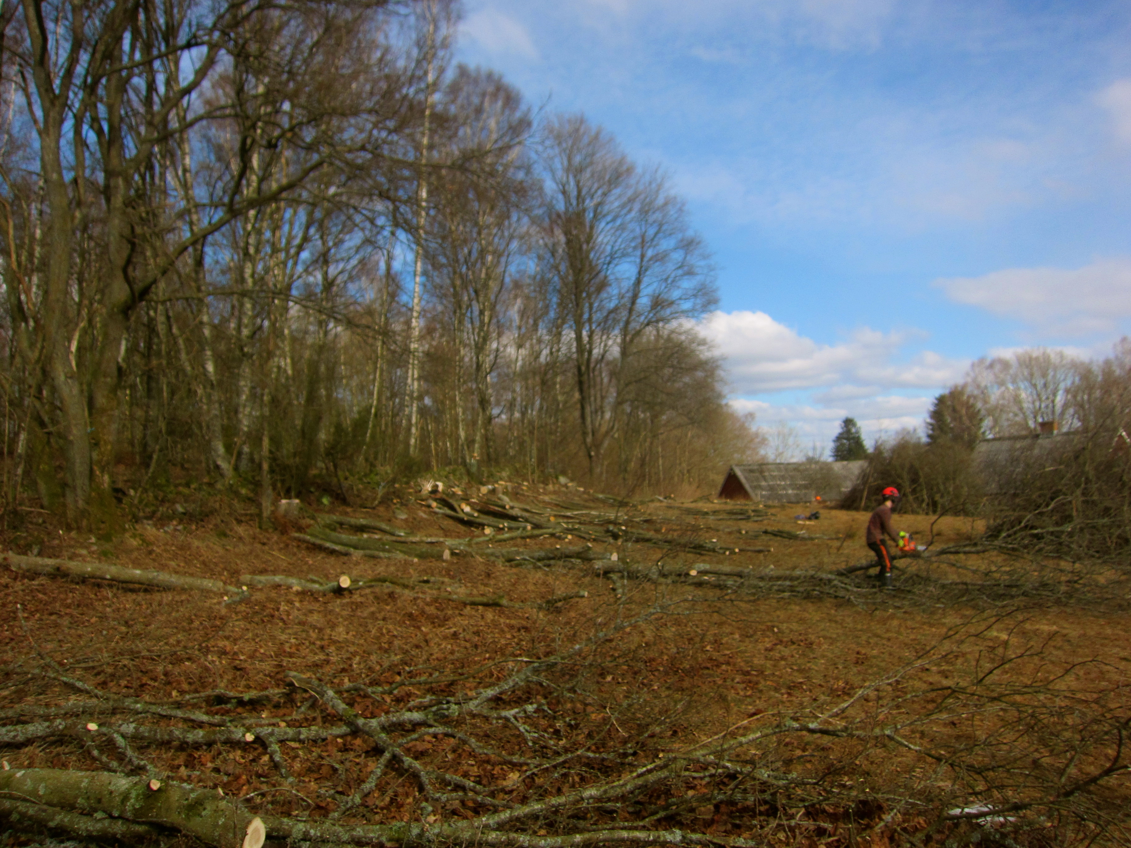 På många håll i världen är det brist på träd allt mer skogsmark tas i anspråk av jordbruket för att odla eller beta. Här hemma är det tvärt om vi har för mycket skog och en akut brist på betesdjur som kan hålla landskapet öppet. Så vill man arbeta med att bevara den biologiska mångfalden som man hittar i betesmarker och ängar är ett av dom viktigaste redskapen motorsågen. Här ovan ser ni vår praktikant Ben i full färd med att kvista och kappa upp en ek. Det stycket som vi arbetar på har varit i min frus familjs äga i flera generationer och har varit utarrenderat under lång tid. Gammelmormor Inga som bor i huset som man skymtar i bilden tror att det var mer än 40 år sen man kanthögg sist. Mycket av stycket har varit bevuxet och ännu mer har varit skuggat av alla träd som kryper sig in och för varje år tar mera i anspråk av stycket. Men nu när vi sågar tar vi inte allt, kvar lämnar vi äppelträd, rönn hagtorn lönn och plommon. Man blir glad när man hittar 3 lindar som vi kan börja hamla och ytterligare bidra till att återskapa ett mer ursprungligt utseende.