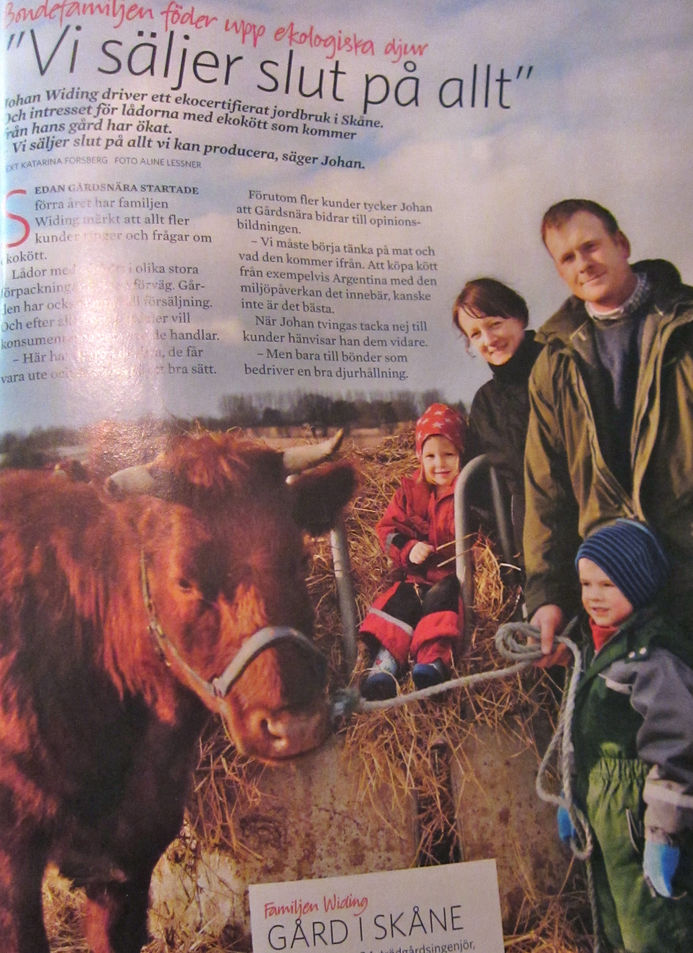 Känns alltid lite lustigt att se sig själv i tidningen och läsa vad folk skriver om en, i senaste numret av Expressens bilaga Leva &bo på landet kunde man läsa om oss och Gårdsnära.se arbeta med att skapa en portal för konsumenter att hitta producenter, i tidningen finns även kontaktinformation till producenter i dit län där du kan köpa köttlåda direkt från bonden som fött upp djuren. Våra Skånsk röd kossa Hanna-Lovisa pryder en sida och låter oss i familjen vara med på ett hörn, Skånska röda är den perfekta rasen för dig som vill ha trevliga djur, mjölk och kött till den egna familjen och utmärkta och anpassade naturvårdare för sydsvenska förhållanden.