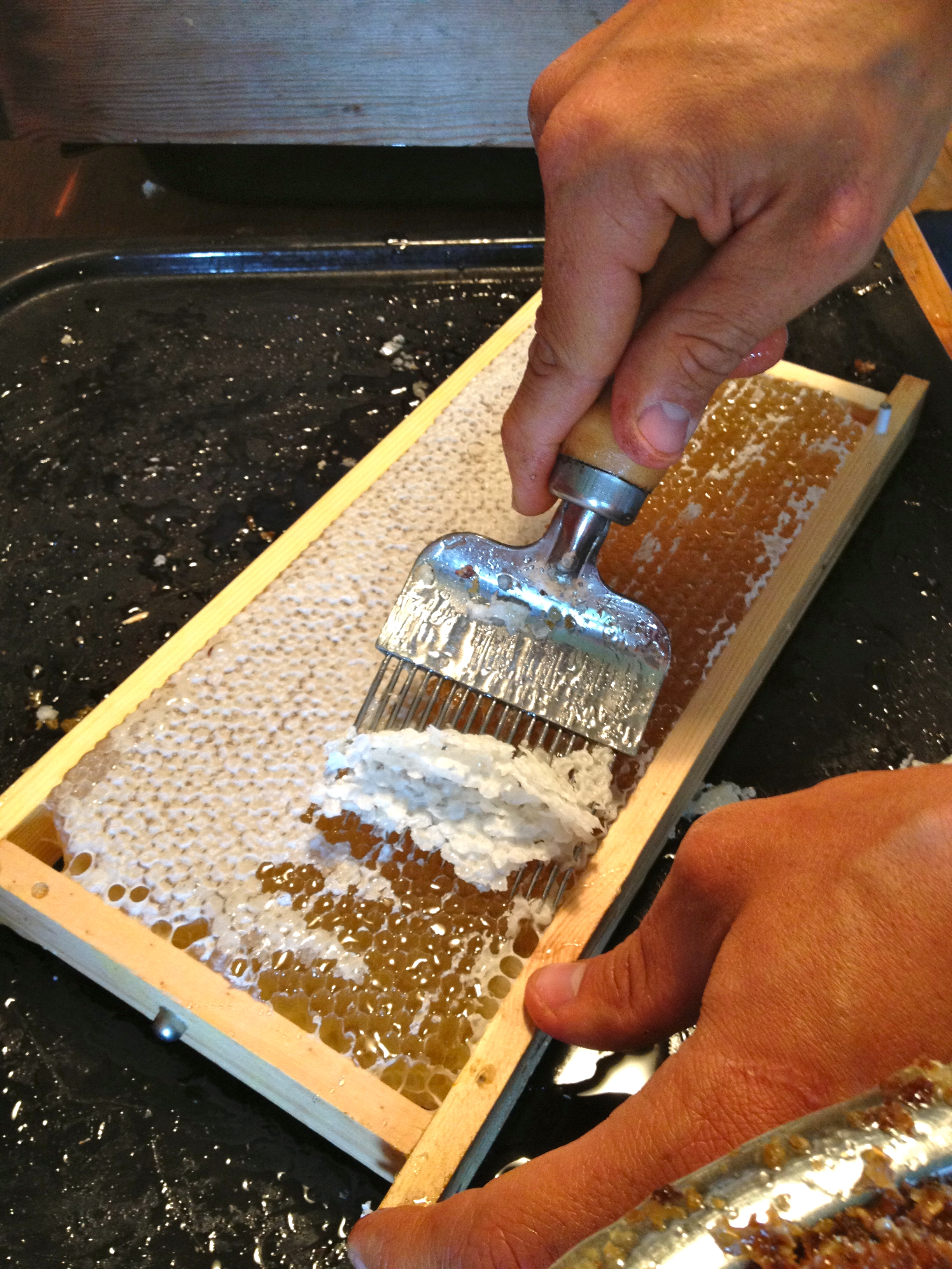 Innan dom slungas måste täckvaxet tas bort med hjälp av en specialgaffel praktikanten Frank blev snabbt ett proffs på detta. Vår slunga har plats för 4 vanliga Svearamar eller 8 halvramar, en hel kan innehålla 2 kg honung och dom halva 1 kg.