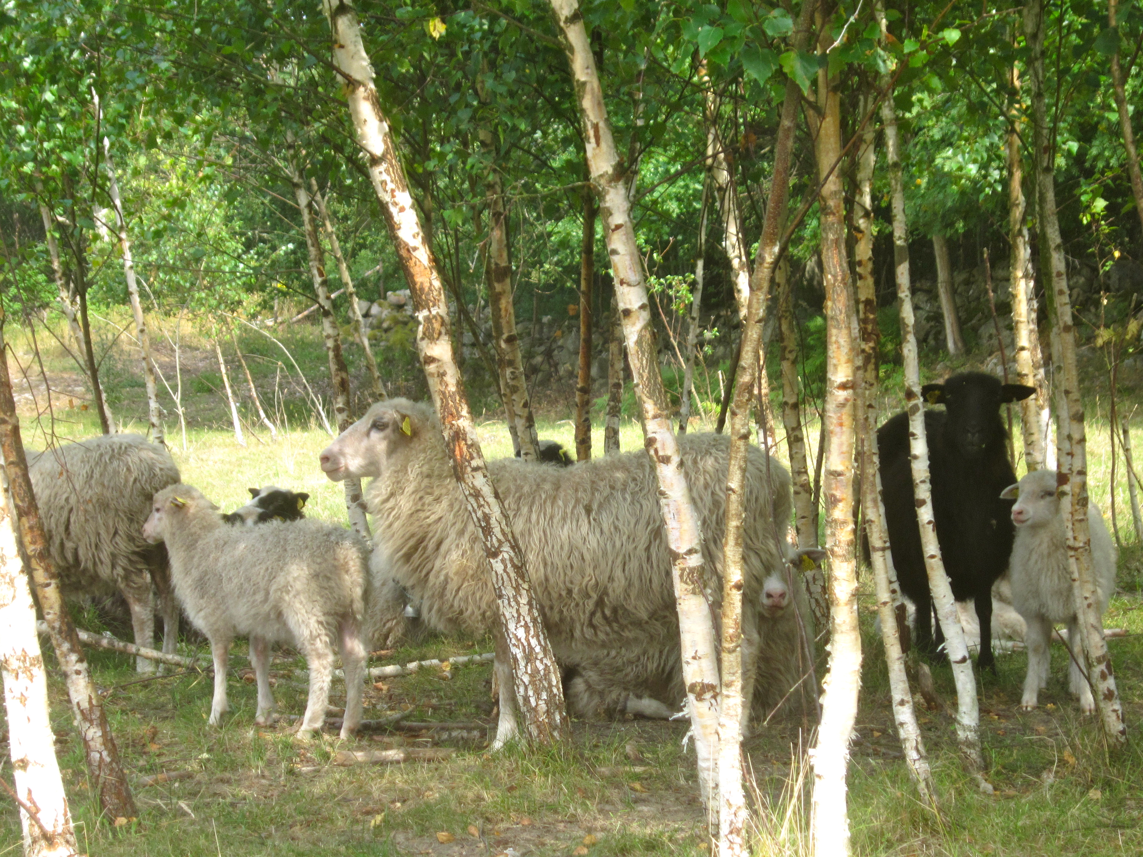 Årets än så länge varmaste dag tillbringas bäst i skuggan av några unga björkar i väntan på en bris eller att kvällens skall ge lite lindring. Med tanke på att fåret var ett av dom första djuren som domesticerades för mer än 10 000 år sedan i det som vi kallar för Irak/Iran borde dom vara vana vid värmen och en torr svensk sommar. Men att se hur dem påverkas av värmen kan man lätt se att anpassningen som har skett av våra nordiska kortsvansfår har varit mycket effektiv. Innan dom flyttade ut på betet i våras klippte vi alla djur så dem inte skulle behöva släpa runt på en massa onödig ull men tittar man på dom nu så är det flera av dem som börjar bli ganska påpälsade. Klövsjöfåret har en stark och slitstark ull av ryatyp även om kan hitta dom flesta ulltyperna på djuren i vår flock, det är himla praktiskt för forna tiders bondmoror. Från sin flock fick man ull till allt från sockar vantar mössor till stoppning för sadlar och seldon. För finare arbeten är sommarullen den bästa stark och glansig efter en hel sommaren utomhus, vinterullen är ganska livlös och har ofta en del rester av vinterfodret kvar.