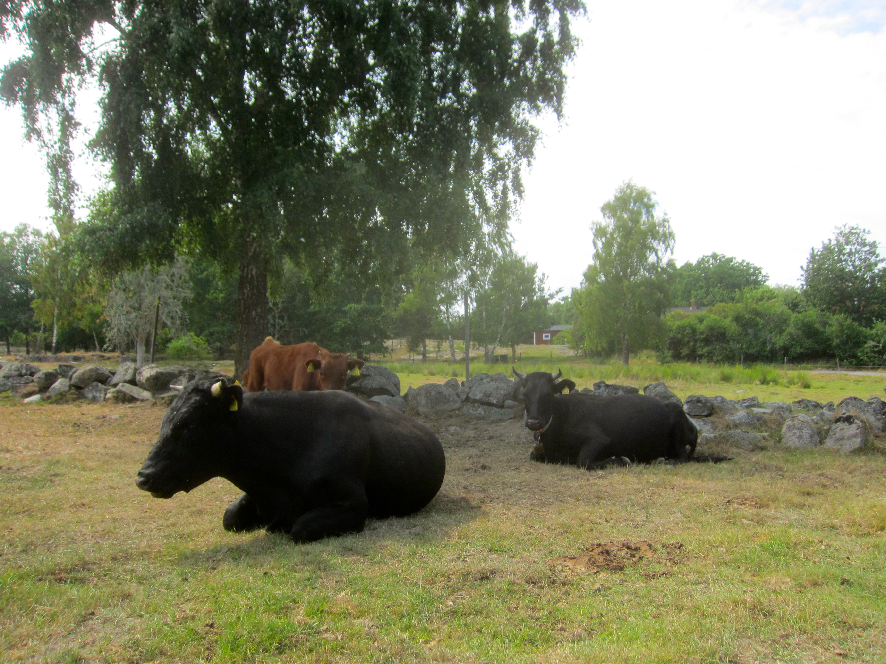 Inte bara Klövsjöfåren söker skugga vår Granemålatjur Jessy James och hans donna Inga låter sig inte rubbas av en tjurkalv som är betydligt mer sugen på att bussa lite än att bara ligga och vila sig. Det finns inte så många Granemålakor här i välden och i år är första året som vi har haft många nog att dela på dem i flera olika betäckningsgrupper, anledningen till detta är att vi vill ha så många olika kombinationer av olika djur som möjligt, alla tjurar skall få möjligheten att delta i bevarandet och vi är nu i ett läge där alla kvigkalvar kan gå till avel.