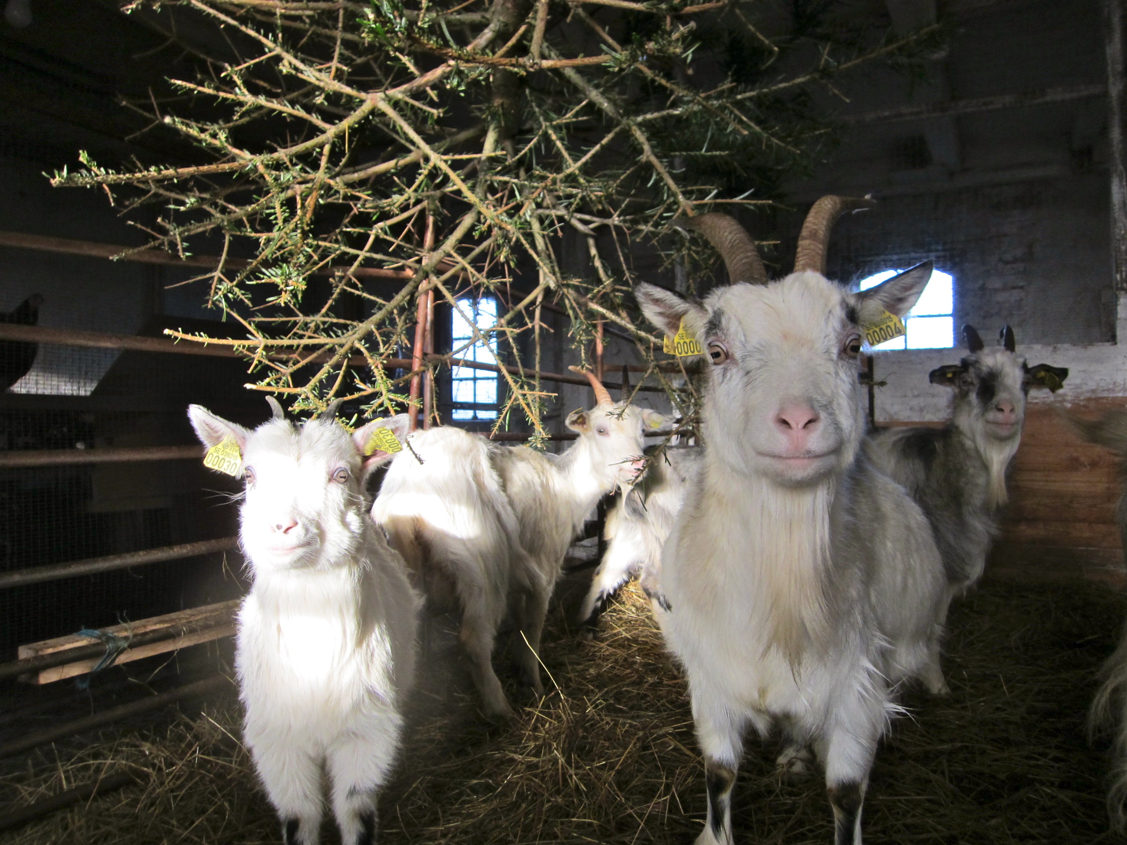 Vinter är vår mest aktiva tid med djuren då alla är hemma från sina olika beten och det dyker upp en massa ungar mest hela tiden, i nästan alla våra stall rör sig det blivande mödrarna tungt i väntan på nedkomsten, vi har en ganska utsprid lammning och killning och för korna kommer kalvarna under hela året. Vinter är även en bra tid att förnya gamla vänskapsband mellan skötare och djur. I alla grupper finns det riktigt tama individer som gärna kommer fram och hälsar, betydelsen och vikten av dessa djur kan inte underskattas för de visar resten av flocken att det inte är något farligt och att det möjligen kan bli något gott att smaka på i form av en liten lockgiva. Eller som i detta fall vår fd julgran som har fått ett nytt liv som hos getterna där de kan äta klia sig och stänga mot under nån vekast tid nu. När de inte har träd och buskar att leka med passar en gammal julgran perfekt.