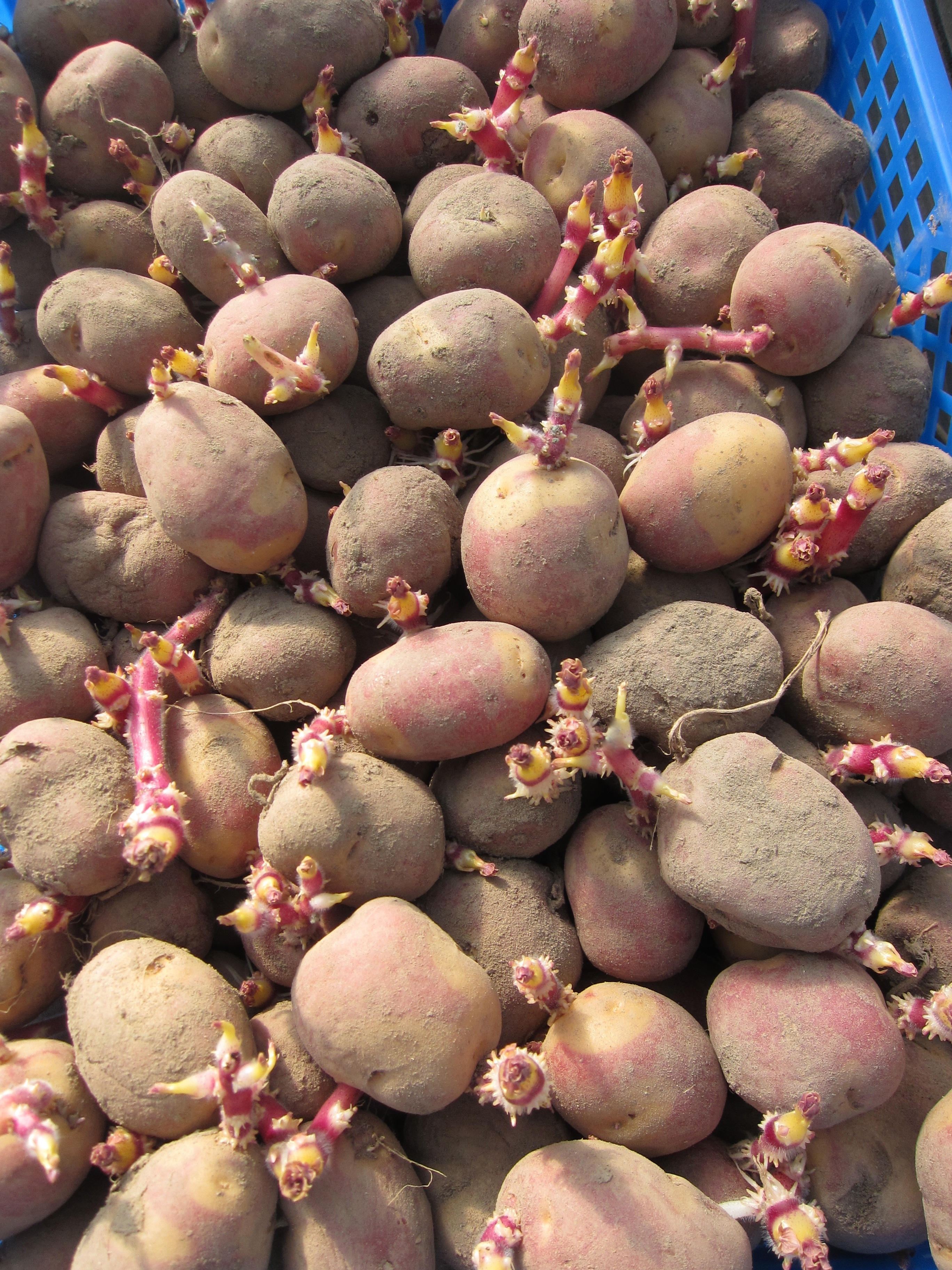 Nu när trädgården är gödslad och plöjd skall det första lådorna med potatis få komma ut i växthuset, det kommer att bli ganska många innan det är klart, Ett hundratal olika sorter brukar vi sätta varje år, några riktiga klassiker som Jämtlands vit och Dalslands blå men även lite nyheter som Apache en vackert röd potatis med fina gula ögan som vi fick en stor låda sättor av från våra goda grannar i Högseröd.
