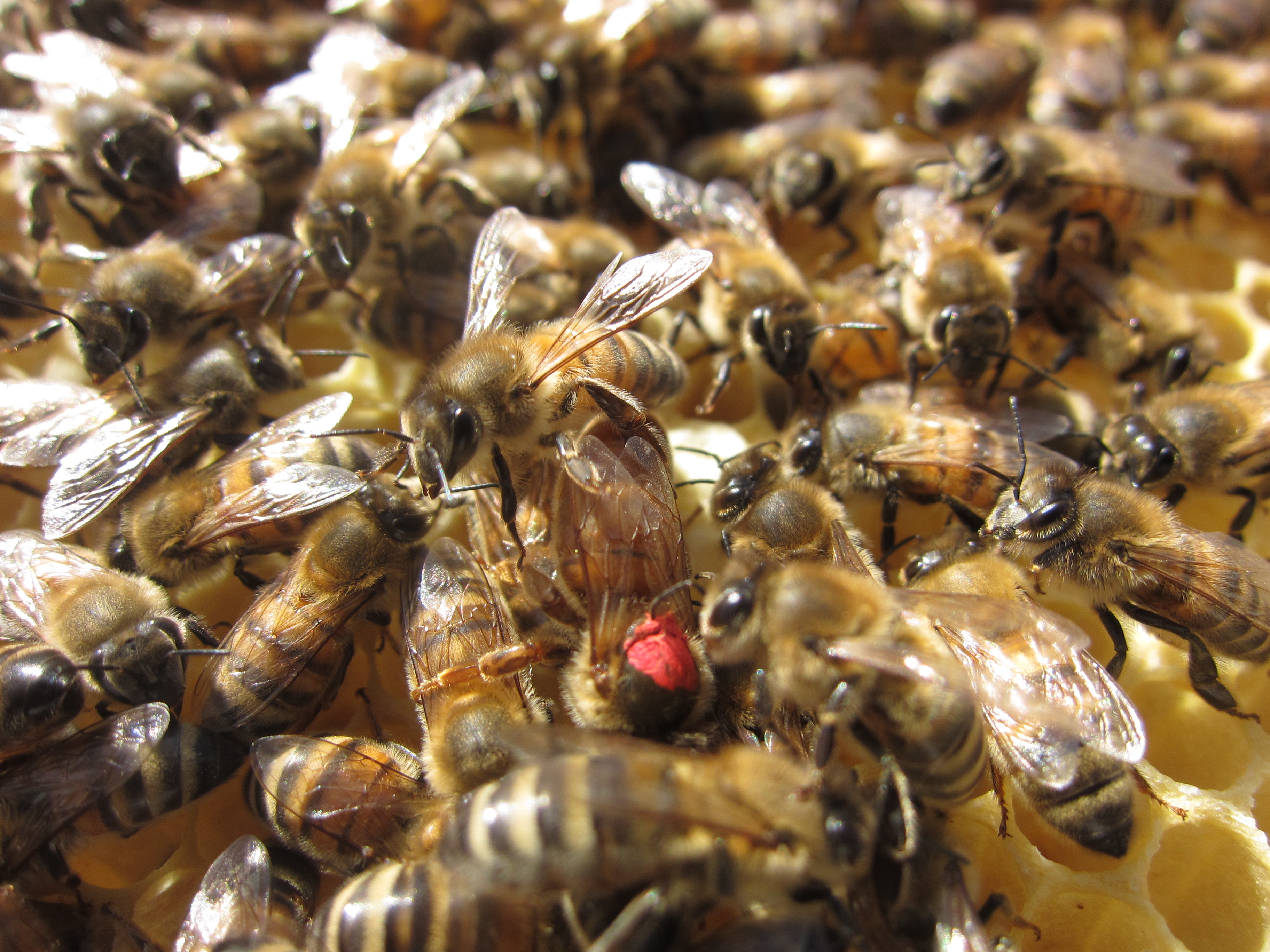 På Bokeslundsgården håller vi oss med våra egna kungligheter i hönsgården regerar Queen Silvia med sin tupp, men i kuporna är det drottningen själv som bestämmer. 1 Maj är lite av ett riktmärke för bigården, det första skattlådorna har kommit på och vi har även gjort det stora flertalet av årets avläggare. Så från 16 samhällen i morse har vi nu 28, alla är lite olika i hur långt de har kommit i vårutvecklingen. Medan det flesta av samhällena var kraftiga hittade vi även två där drottningen inte var närvarande, hon gick inte att hitta och inga ägg eller larver heller bägge två fick ramar med färska ägg och vi hoppas nu att de själva drar upp en ny drottning. Drottningen på bilden har ett rött märke på ryggen, olika år har olika färger för biodlare och ett rött betyder att hon är född 2013