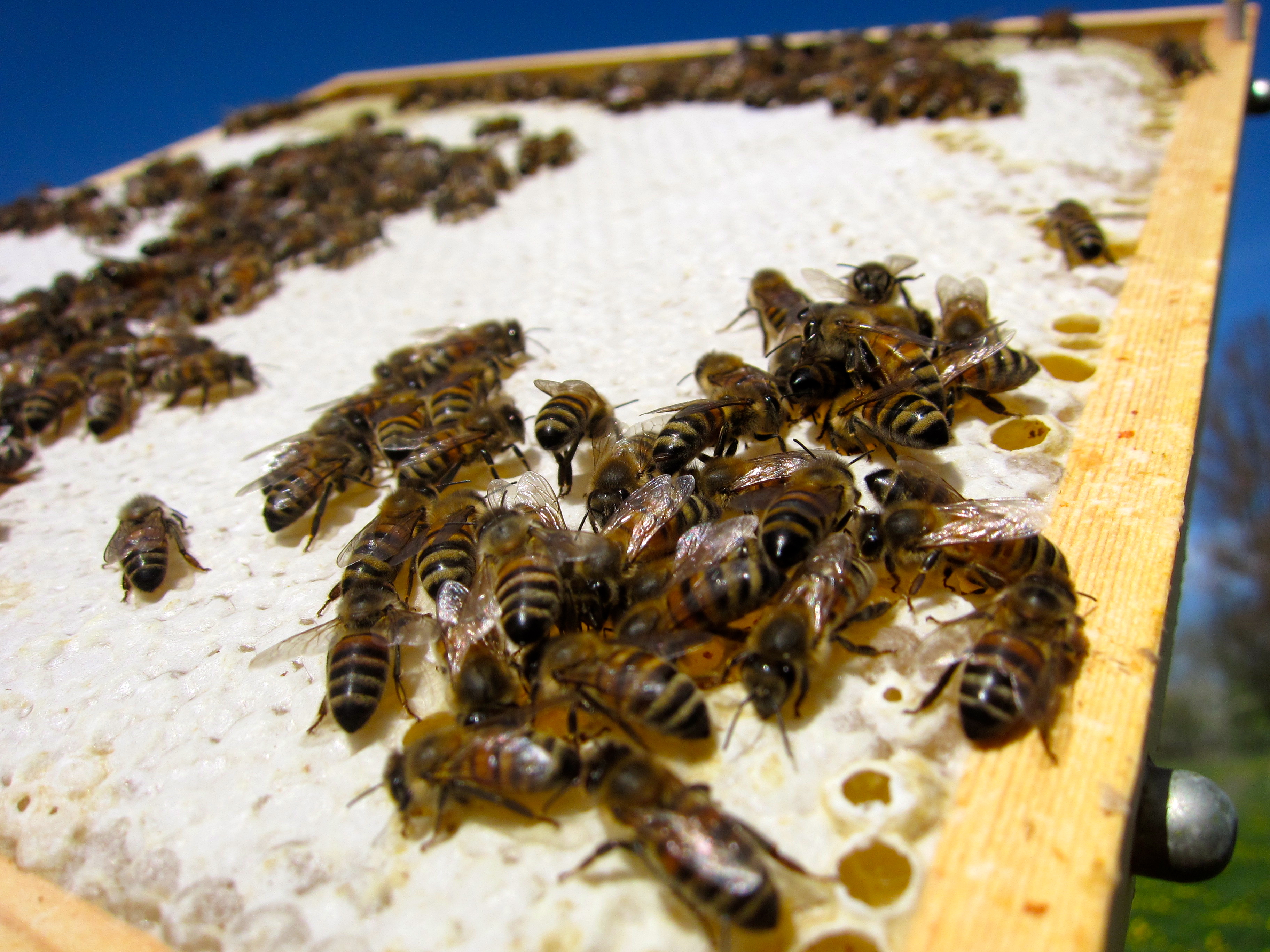 Starka samhällen betyder att bina mår bra och det ger i sin tur mycket honung. Flera honungsramar täckta med vit vax hittade vi redan trots att rapsen bara har börjar att blomma. Rapsen brukar vara den grödan som ger mest honung och är en mycket välkommen start på honungssäsongen. När bina väl har klarat vintern på sina foderlager hittar de många vårväxter som ger dem både nektar och pollen men ingen av dessa kan mätta sig med rapsen i ymnighet.