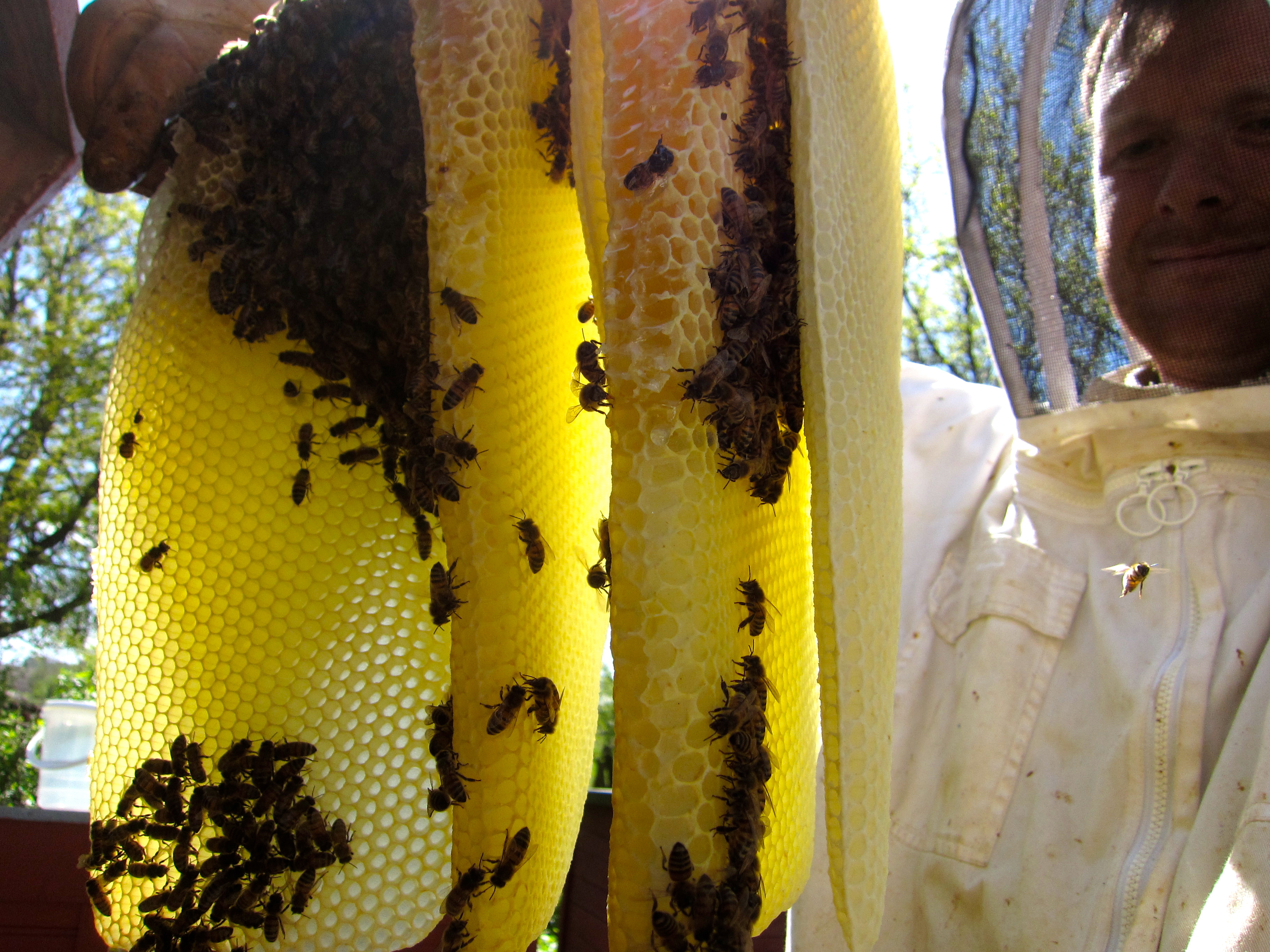 Vår tvillingkupa har exploderat med bin det är så många att som har hittat på en massa kreativa saker som att bygga vaxkakor utanför ramarna. Även om det är väldigt vackert och beundransvärt är det helt omöjligt att skörda dessa vaxkakor när dom är fulla med honung utan att förstöra dem helt och störa samhället kraftigt. Därför fick denna första gyllene honungen bli det där lilla extra vid dagens lunch och bina får riktiga rammar att bygga på i stället.