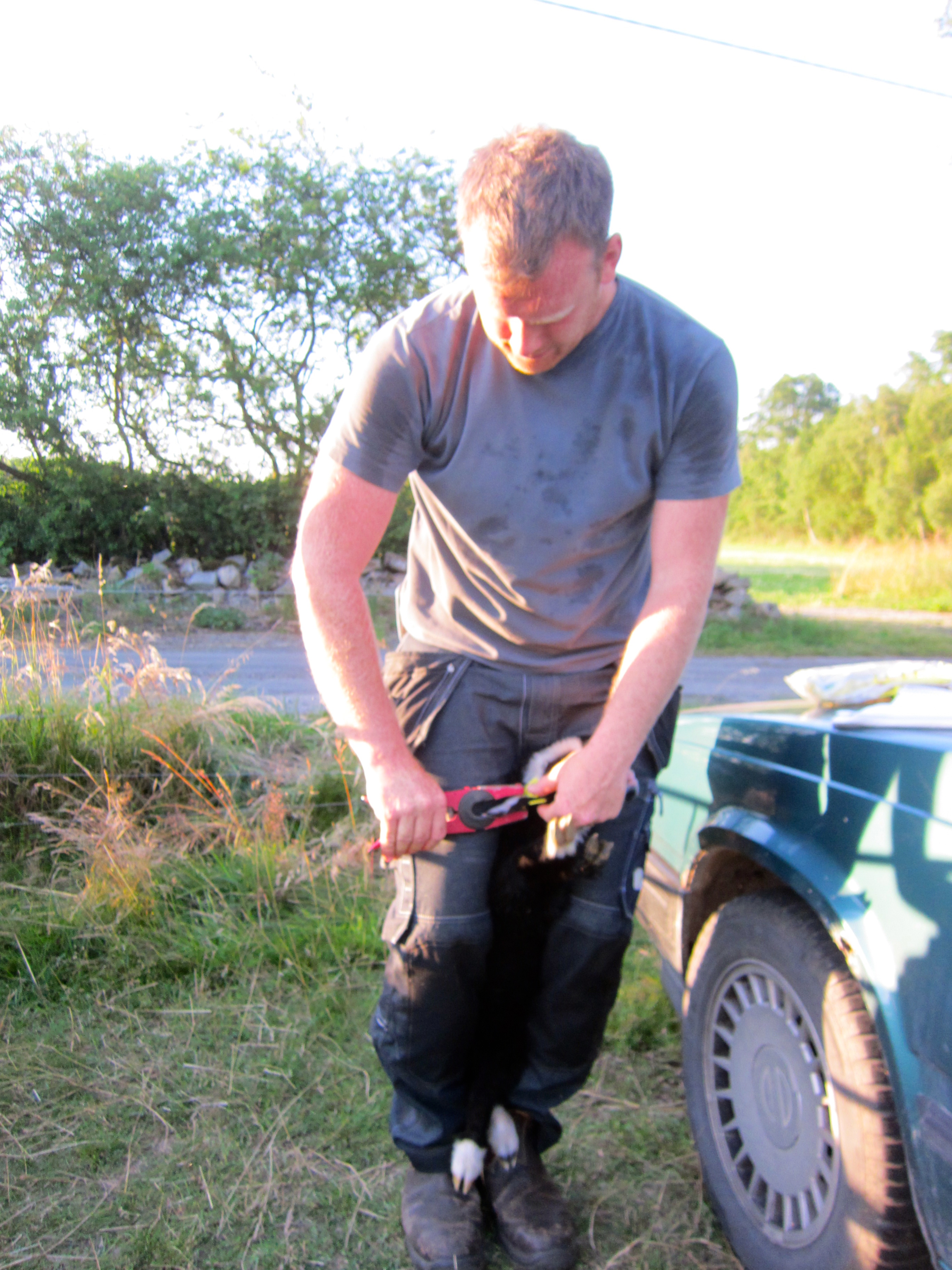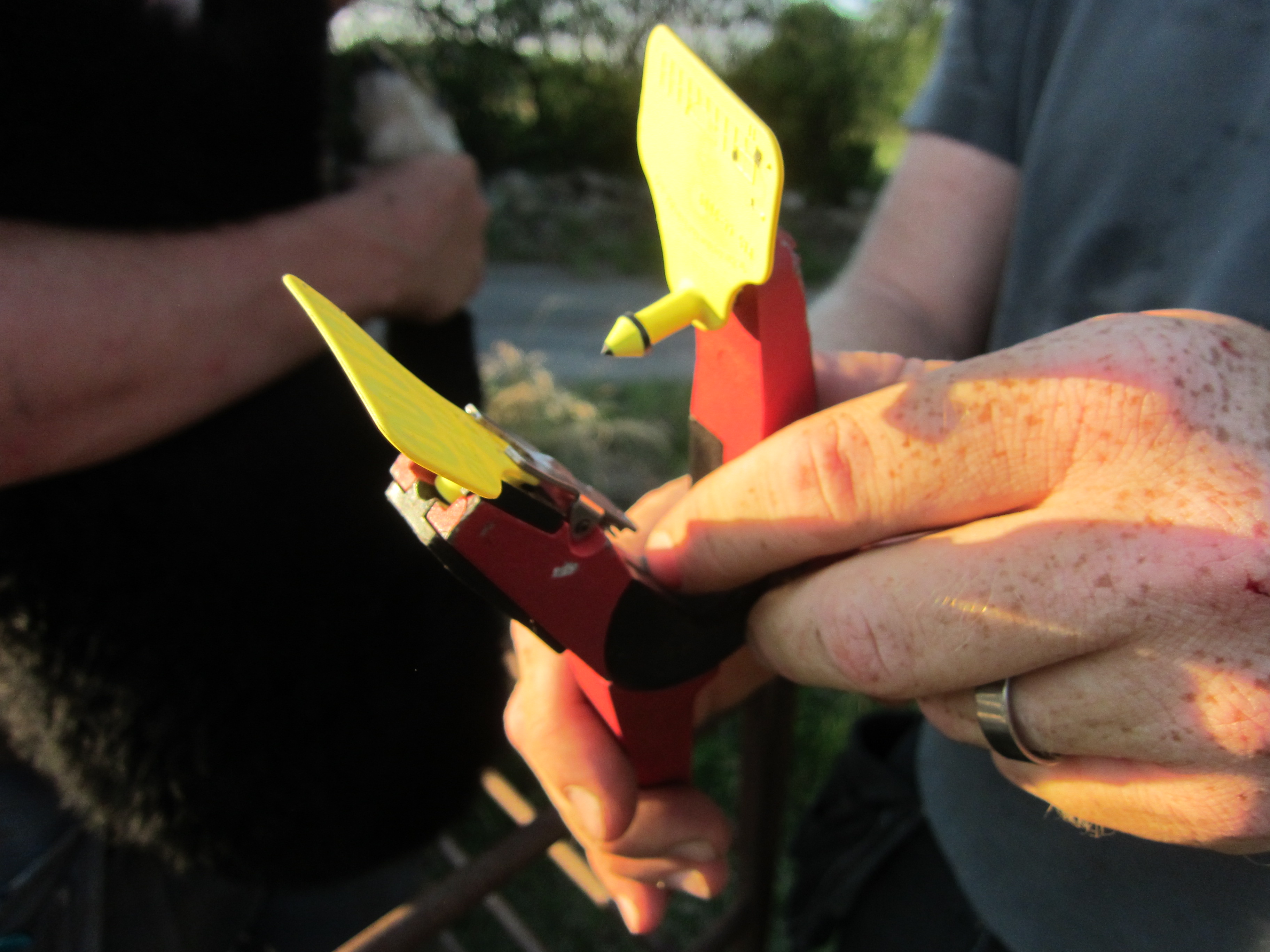 Dock fick en del lamm bli kvar på betet, en del av tackorna tog sig dräktiga sent och hann inte lamma innan betessläppet och dessa lamm fick nu i stället sina fina öronmärken. Många djurägare upplever att dessa öronmärken är ett stort problem men det är inget vi känner igen. Har man som vi mer än 30 tackor blir det nästan det dubbla antalet lamm och det är omöjligt att veta vem som är lamm till vem och då riskerar man att tappa härstamningen och då kvalitén i bevarandet. Varje djur har två nummerserier det ena SE 070341, vilket alla kor får och grisar hemma hos oss får, detta nummer är knutet till våran gård och gör att det går att spåra djuren om vi skulle få ett utbrott av en smittsam djursjukdom. Den andra serien är löpande och för oss betyder det att årets första lamm fick nummer 105 eftersom vi slutade på 104 2013. Vi har valt en löpande serie men det går även att utvekla det mera. Några populära exempel är att man startar serien med årsnummret tex 14001, 14002… nackdelen är att man då måste beställa exakt med öronmärken har man för många blir dessa oanvändbara när året är slut. Man kan även ha två olika serier en som börjar på 00001 00002 och en som är 10001 10002 den ena serien använder man för hondjur den andra för hannar då vet man direkt vilket kön djuret har bara genom att titta i örat.