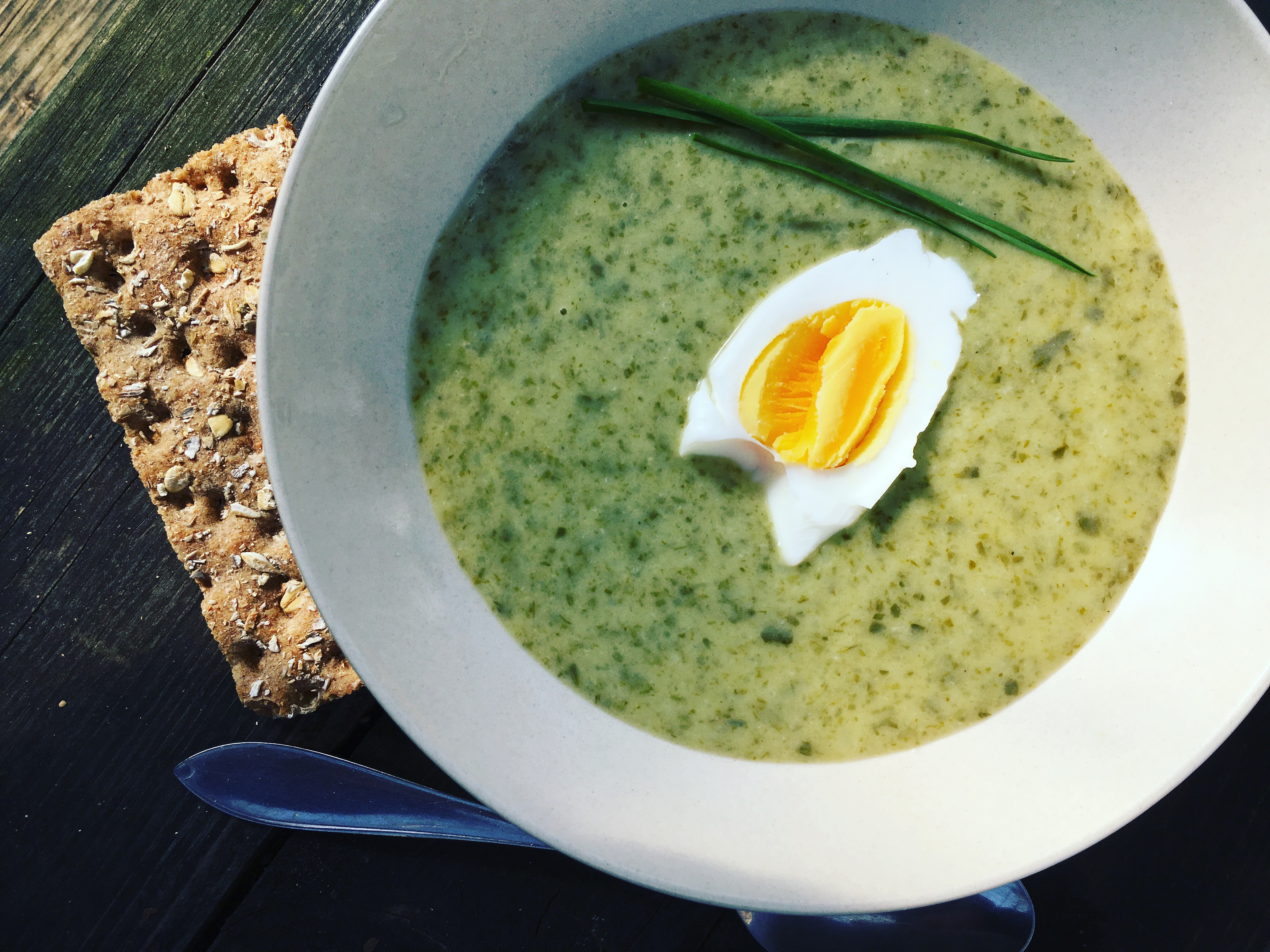 Ramslökssoppa med kokt ankägg och vitlöksgräs perfekt mat ute i trädgården