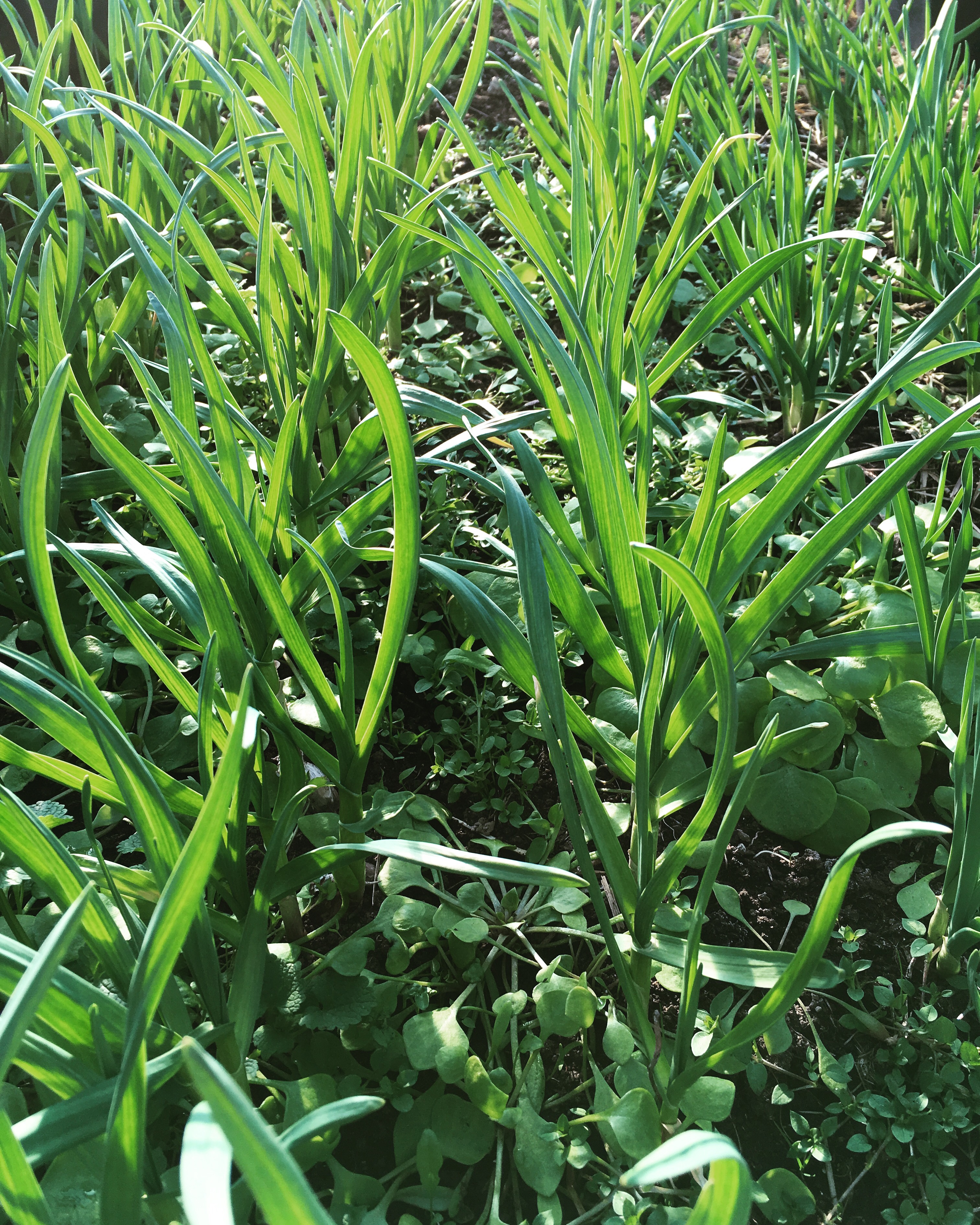 Jorden vill inte vara naken och exponerad och när vi lämnar allt för mycket plats mellan vitlökarna får vi snart sällskap av olika typer av bladgrönt, dessa sår vi inte utan de frösår sig själva er efter år. Det är växter som Plistet, Våtarv och framförallt Vinterportlak