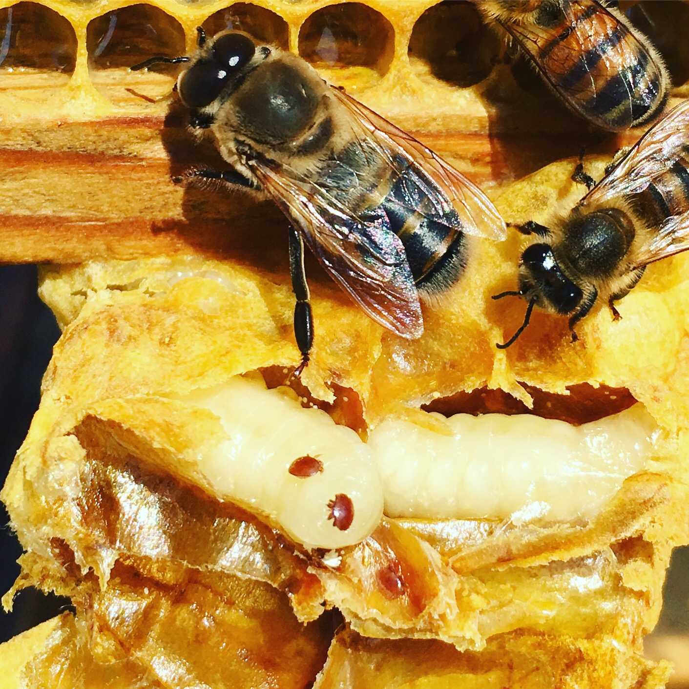 Med ett sådant namn är det uppenbart att det är inget man vill ha på sina bin. Det är ett kvalster och kan på nästan alla sätt jämföras med en fästing, den suger kroppsvätskor från binas larver och sprider sjukdomar, om bina inte behandlas försvagas hela samhället för att till slut dö. Här ser vi två kvalster som sitter i nederkant på bilden mitt på den vita larven. Många biodlare använder bekämpningsmedel som lämnar restprodukter kvar i honung och vax. Vi använder Oxalsyra och Myrsyra som inte lämnar några restprodukter och är nästan lika effektivt, man kan inte utrota kvalstret i kupan utan måste behandla ett par gånger varje år #varroadestructor #beekeeping #honeybees #beekeeper #apiary #bees #apiculture #urbanbees #apicultura #honey #apis #imker #apismellifera #urbanbeekeeper #savethebees #urbanbeehive #pollinator #imkerei #beefarm #backyardbeekeeper #bee #biodling #hive #beehive #honeybee #pollineramera #svenskabin #bokeslundsgården