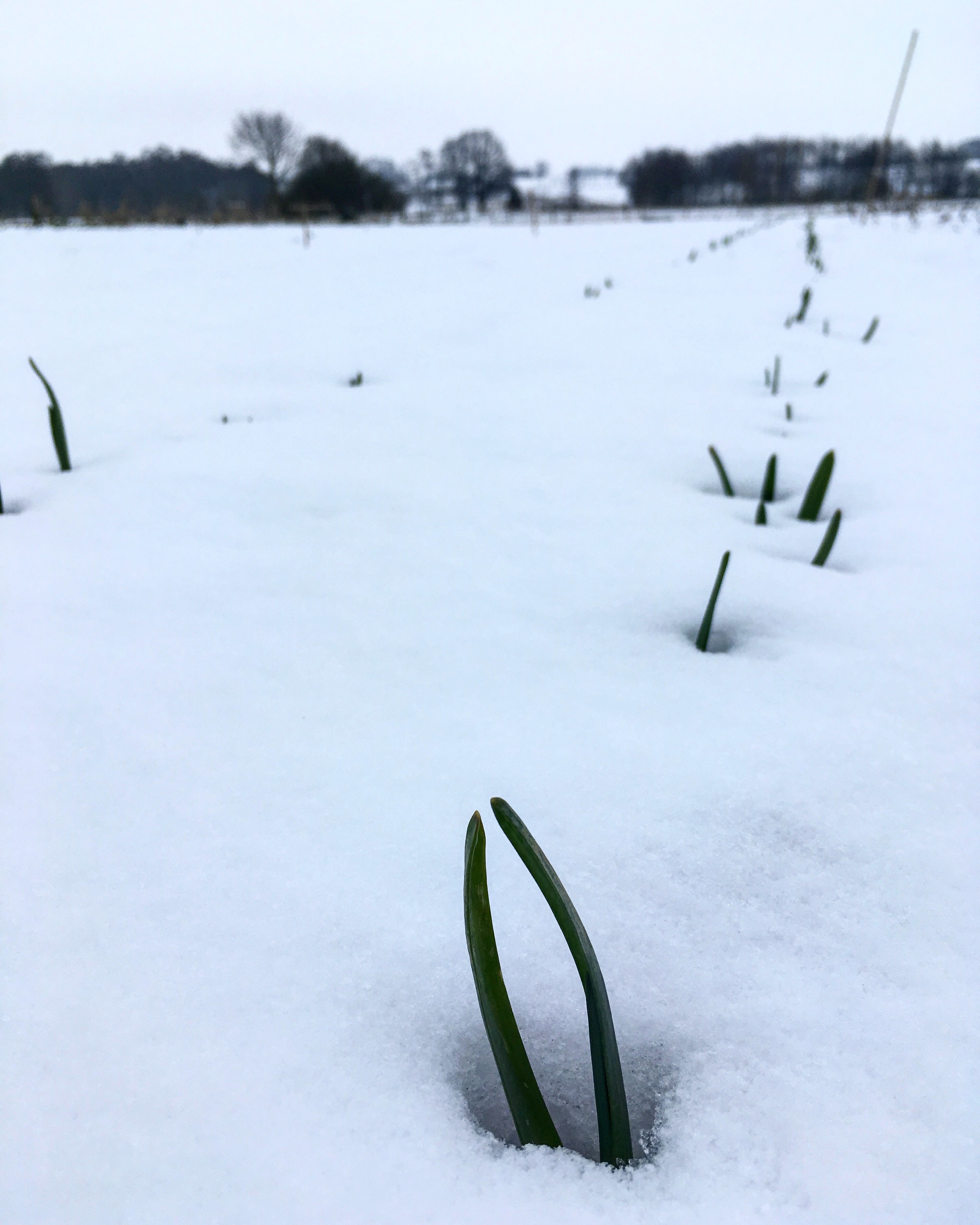 Spring garlic peeking up over the snow waiting for spring #winteriscoming #wintergarden #garlic #cleaneating #sustainablefarming #supportyourlocalfarmer #futureoffarming #sweden #heratige #spring #bokeslundsgården