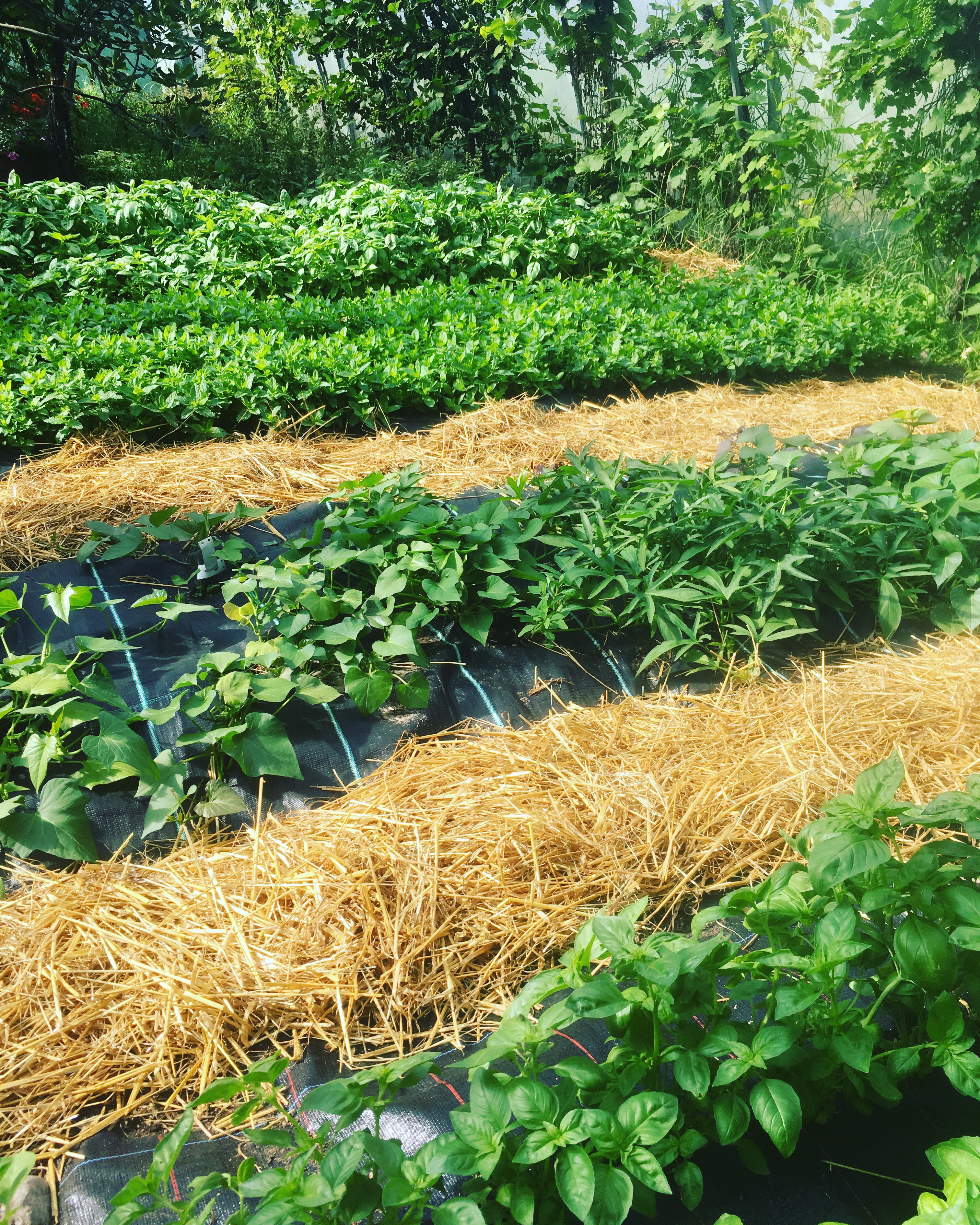 Basilica, sweet potato and mint all loving it in the greenhouse. A tarp underneath too keep the plants clean and the weeds down and in the walkway straw perfect food for our worms and insects. Plenty of water now it’s heat we are missing