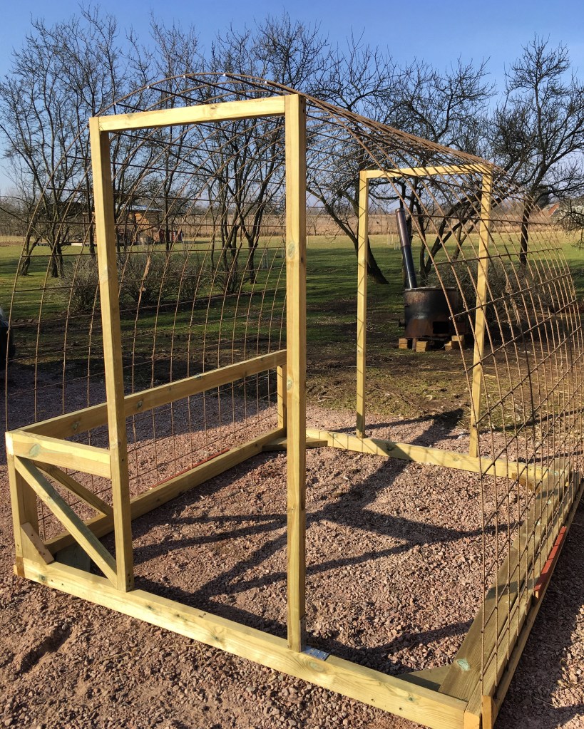 We have a few different greenhouse but today we are going to look closer on the newest ones we have the rebar mat house. It all starts with how tall you want you greenhouse to be, I’m 194 cm so I like it tall so I can stand up inside. You can test this by bending the mat until you have the height you are happy with. It gives u the with and depth of the greenhouse together with the height. Too solidify we have a extra frame about 50-70 cm about the bottom to stabilize and protect the greenhouse during winter with snow sliding of the roof down on the side otherwise risking too deformed the base. We also have a frame in place for the door that will have a 2”x2” going from each top of the door to the one on the other side also helping too solidify the rebare mat. Left to do her is also the doors and put plastic on, his model is our take on a popular concept and making it mobile so we never shift the soil in the greenhouse but shift the whole greenhouse instead making it a part of the crop rotation we have in our garden.
