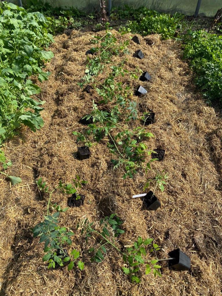 Here we have a reverse photo series starting with us putting on compost then straw and planting and the finished bed.