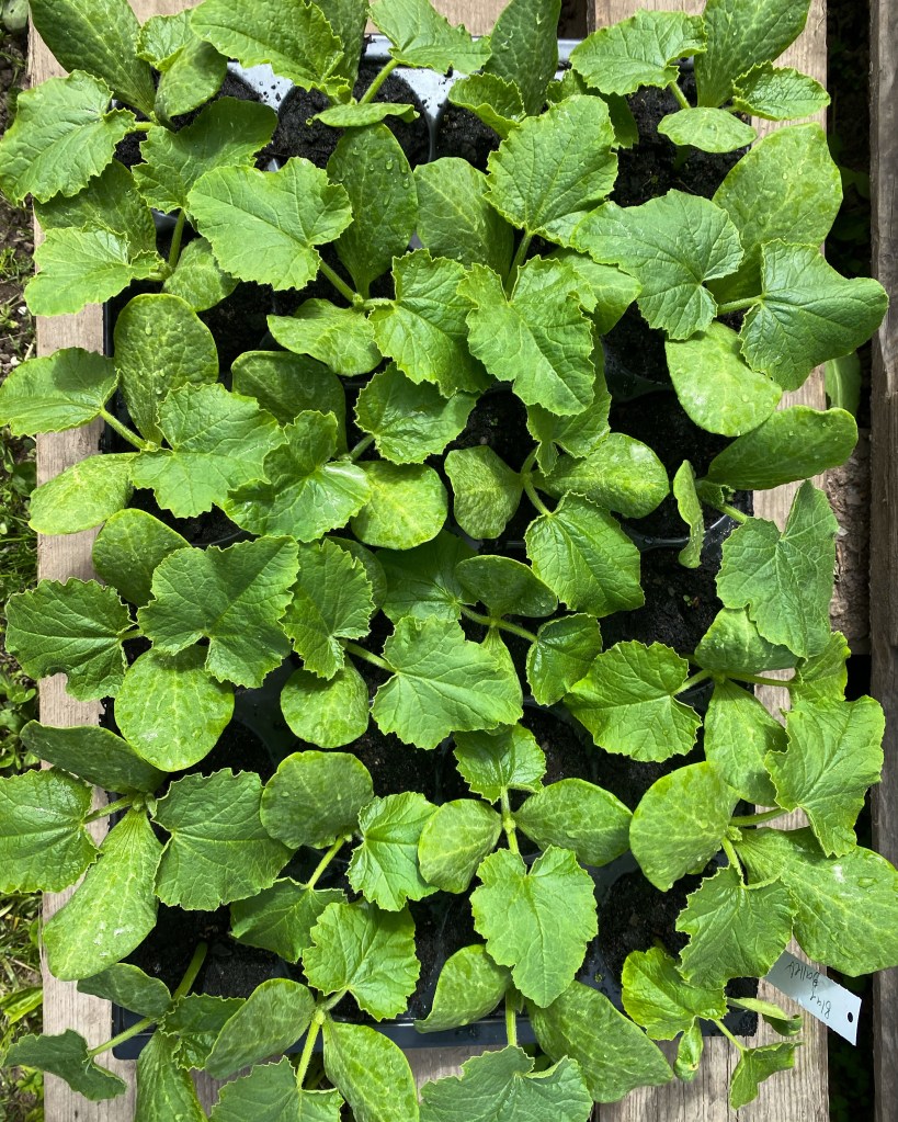 A tray of winter squash Blue Ballet absolutely perfect for planting, roots hold the soil in the pot together and leafs are not too big or started too turn yellow due too lack of nutrient lack in the pot.