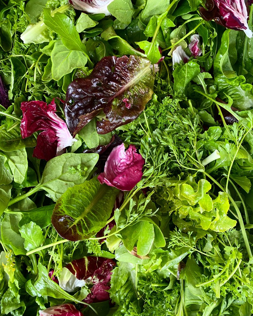 This is our saladmix going out this week, almost end of season but still pack with Roman lettuce, pepper cress, radicchio and a lot more