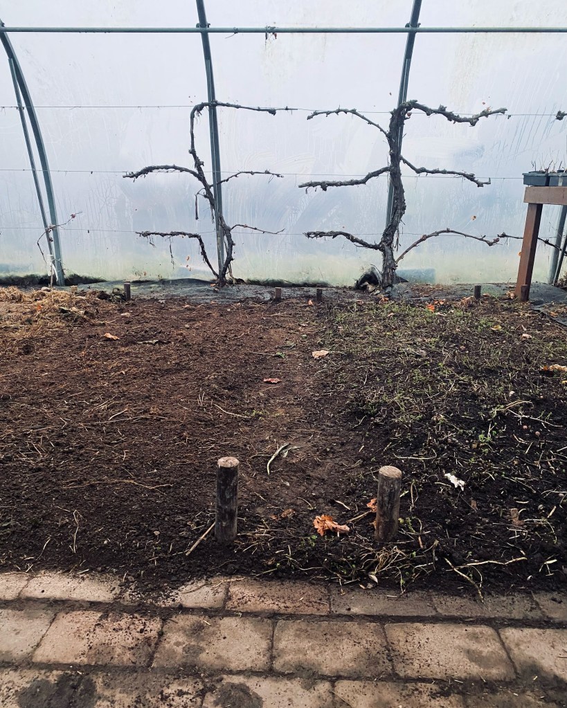 Riktig härlig start på odlingsåret i växthuset med att klippa vindruvorna och ta sticklingar, vår lilla planta längst till vänster är en ny rödbladig vindruva som verkar mycket lovande och väldigt vacker med knall röda blad hela sommaren.
