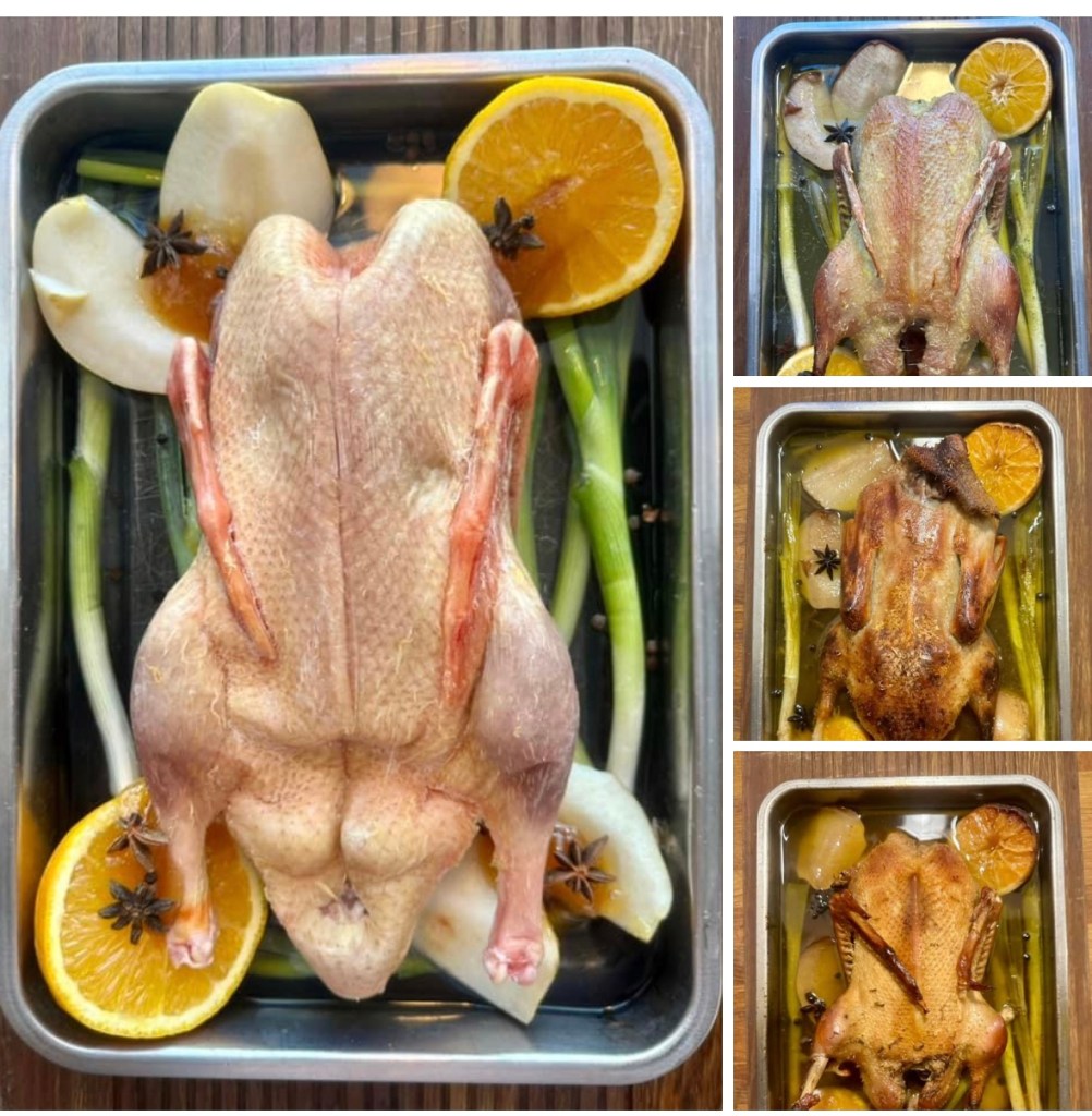 Under tillagningen vänder vi på ankan som tappar en del fet men också tar smak från kryddning.