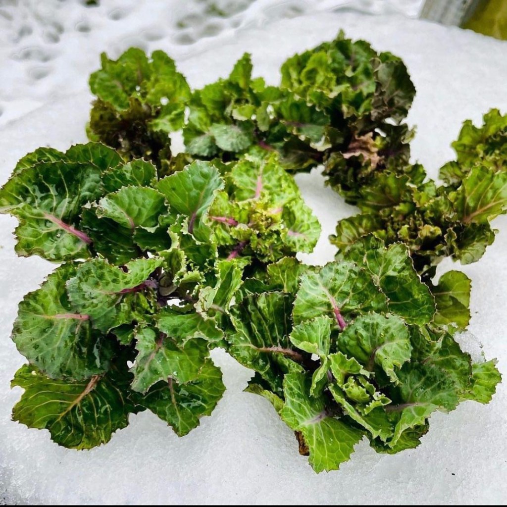 One of the newer types of cabbage that we grow is this cross between kale and brusselsprouts. It takes for ever to grow out but just when you are about too give up on it then it shines. Most stuff is resting in the garden under the snow but these small buds are just possible to harvest now.