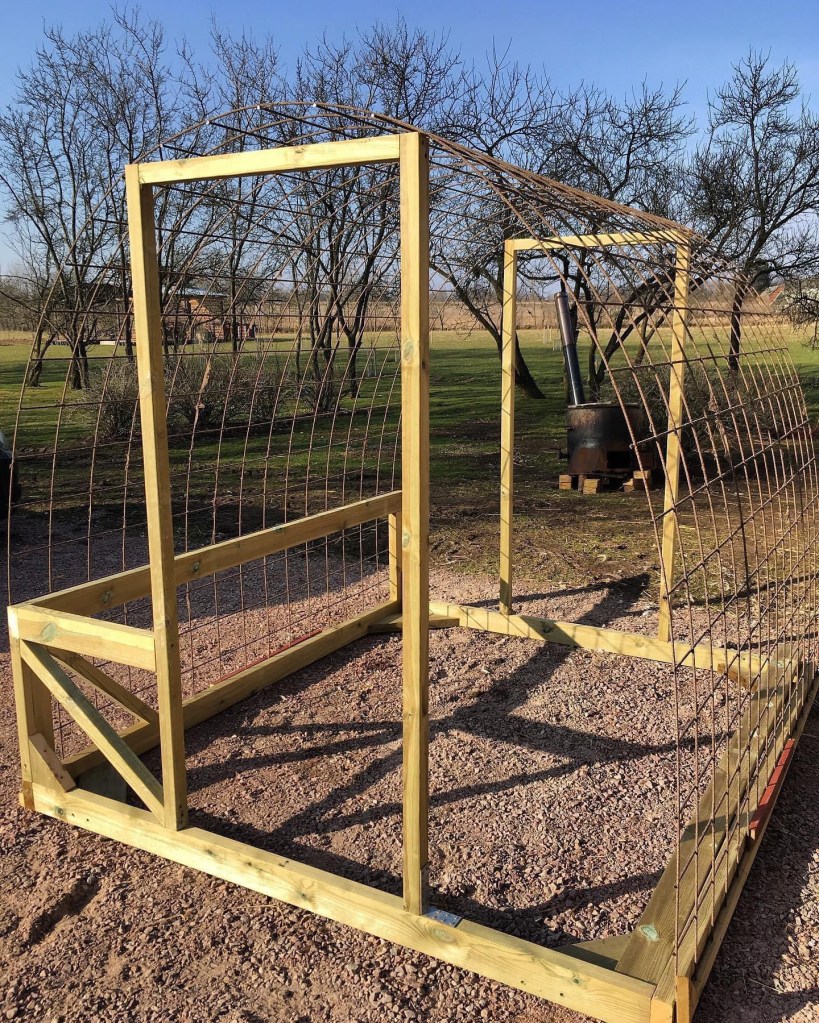 We also have a frame in place for the door that will have a 2”x2” going from each top of the door to the one on the other side also helping too solidify the rebare mat. Left to do her is also the doors and put plastic on, his model is our take on a popular concept and making it mobile so we never shift the soil in the greenhouse but shift the whole greenhouse instead making it a part of the crop rotation we have in our garden.