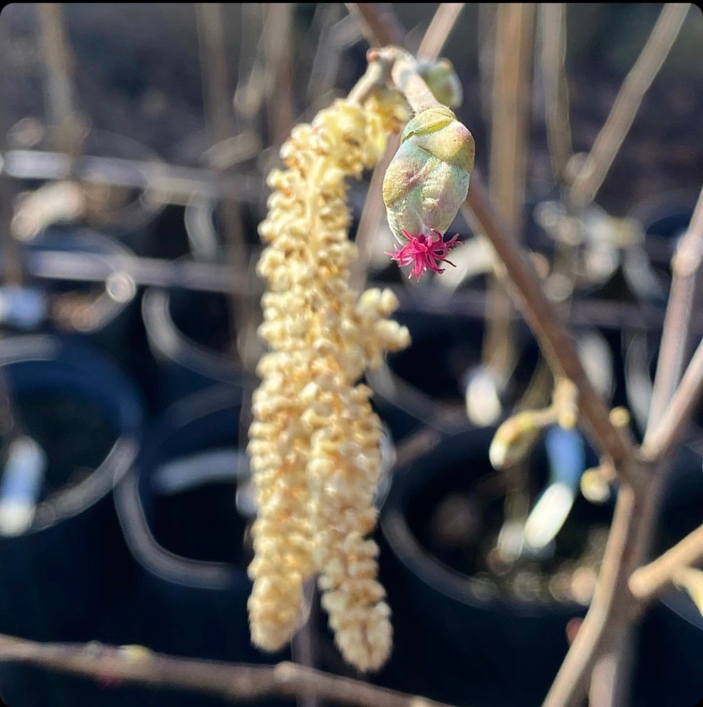Våra stornötiga hasselnötter har redan börjat blomma i plantskolan med det stora hängena med pollen och de små röda honblommorna som senare kommer att bilda nötter.