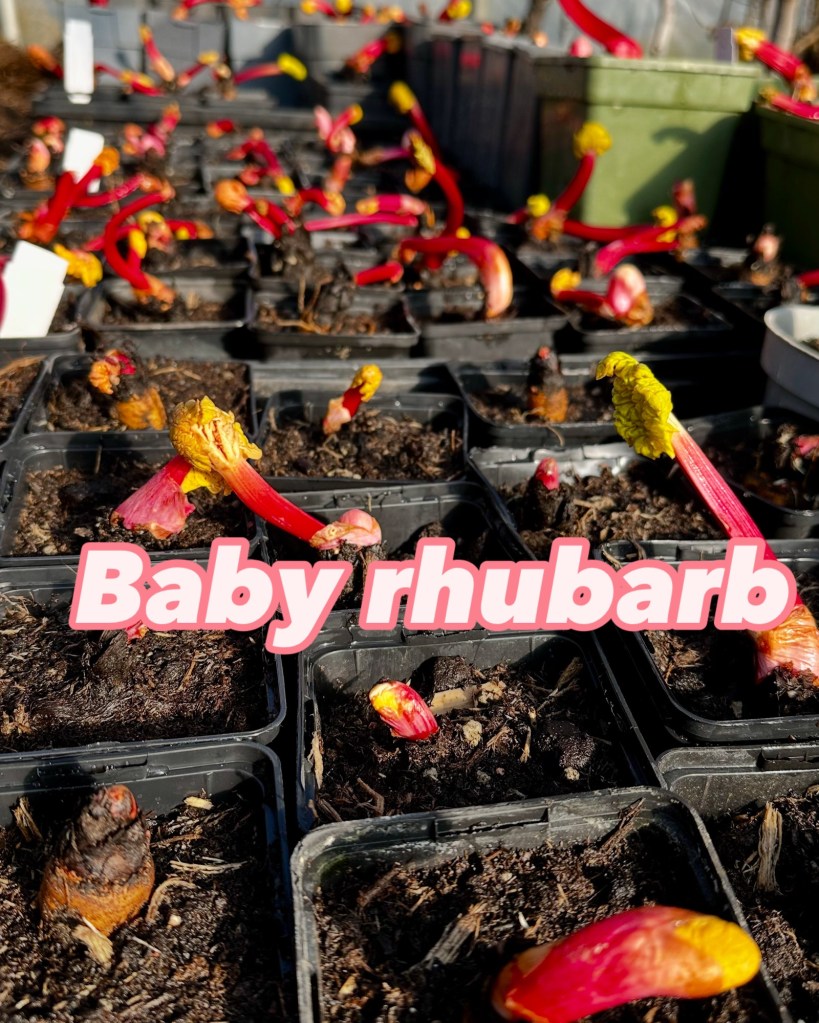 New baby rhubarb have arrived and the started growing in shipping showing off pink stems and yellow leafs, the smaller pots in the front are the correct size we planned for but we got lucky and got some massive ones too in that needed bigger pots.